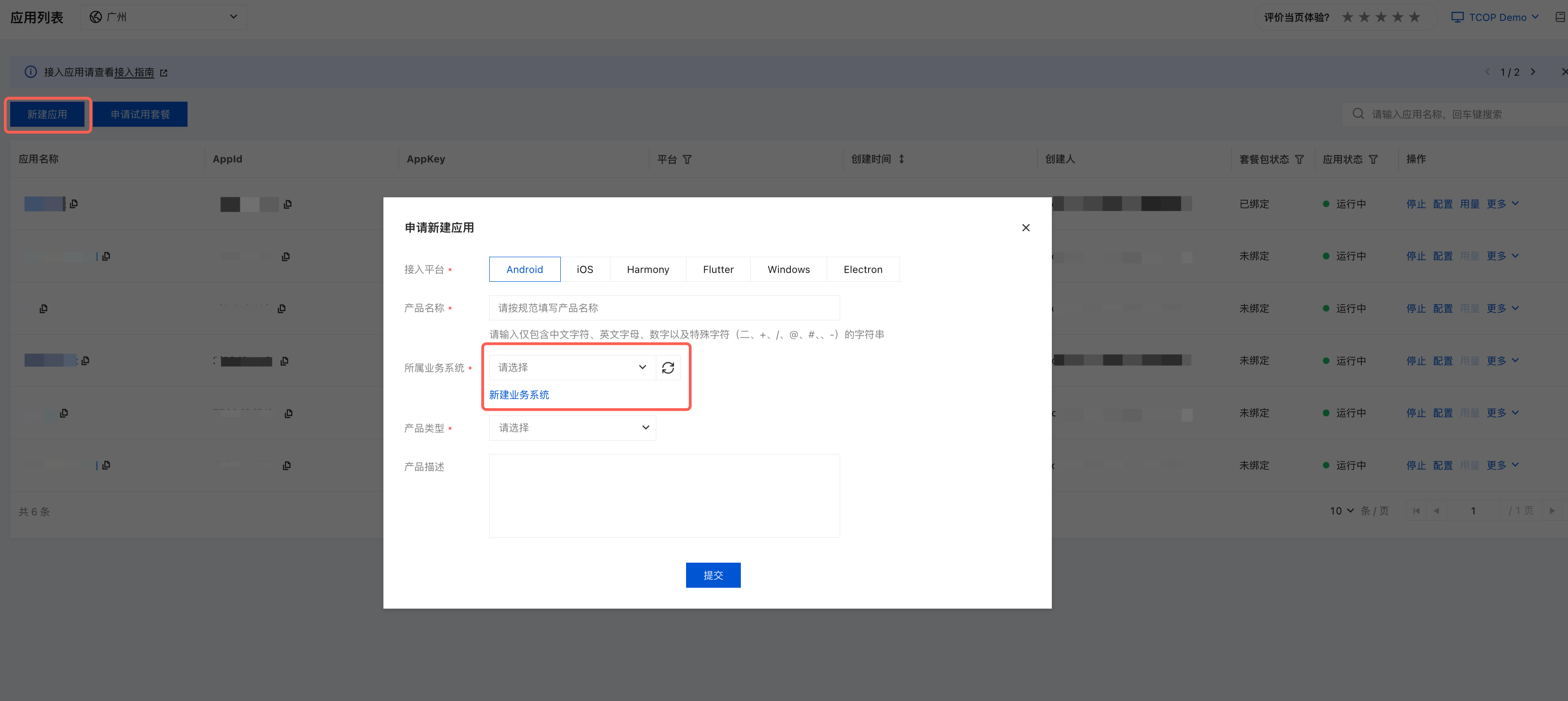 2. 在应用列表页单击新建应用,按要求完成业务系统选择。若您当前没有业务系统,单击新建业务系统可前往 业务系统列表 页面完成创建,填写相关信息。