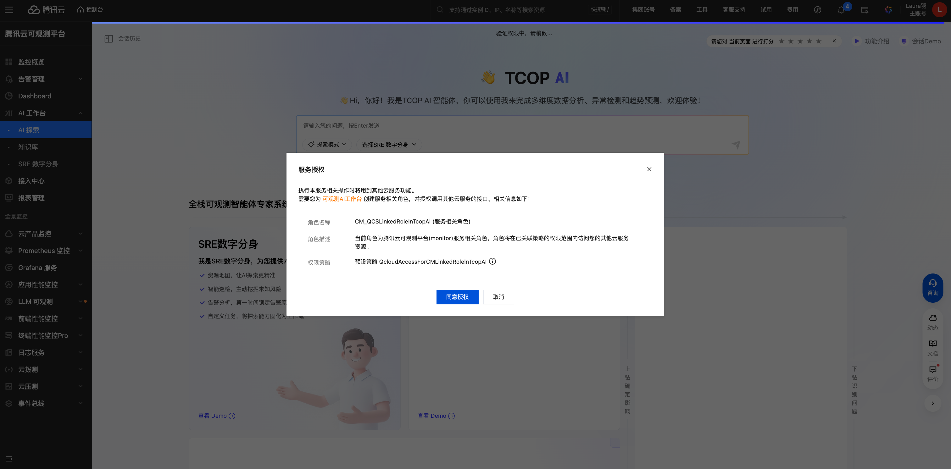 2. 触发授权引导:系统将自动弹出授权申请窗口,提示您需要授予 CM_QCSLinkedRoleInTcopAI 角色权限方可使用 AI 工作台功能。