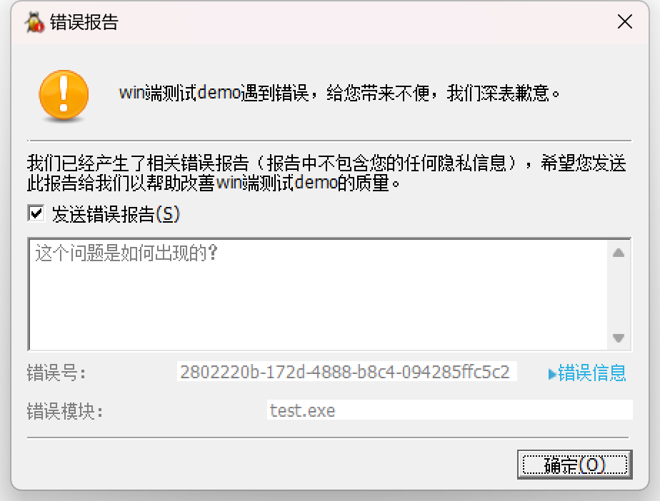 /// <summary>/// 上报自定义错误,这种错误不是 crash,而是业务定义的一些错误,例如业务集成了 lua 捕获的 lua 错误、js 错误等/// </summary>void CustomErrorTest() {std::string addr ="#0 _MyHomePageState._incrementCounter.<anonymous closure> (package:flutter_application_1/main.dart:81:33)";std::string message = "type 'double' is not a subtype of type 'int' in type cast";std::string name = "_CastError(Serious)";std::string thread_name = "main";std::string call_stack ="#0 _MyHomePageState._incrementCounter.<anonymous closure> ""(package:flutter_application_1/main.dart:81:33)\\n#1 State.setState ""(package:flutter/src/widgets/framework.dart:1088:30)\\n#2 _MyHomePageState._incrementCounter ""(package:flutter_application_1/main.dart:73:5)\\n#3 _InkResponseState._handleTap ""(package:flutter/src/material/ink_well.dart:989:21)\\n#4 GestureRecognizer.invokeCallback ""(package:flutter/src/gestures/recognizer.dart:193:24)\\n#5 TapGestureRecognizer.handleTapUp ""(package:flutter/src/gestures/tap.dart:608:11)\\n#6 BaseTapGestureRecognizer._checkUp ""(package:flutter/src/gestures/tap.dart:296:5)\\n#7 BaseTapGestureRecognizer.acceptGesture ""(package:flutter/src/gestures/tap.dart:267:7)\\n#8 GestureArenaManager.sweep ""(package:flutter/src/gestures/arena.dart:157:27)\\n#9 GestureBinding.handleEvent ""(package:flutter/src/gestures/binding.dart:444:20)\\n#10 GestureBinding.dispatchEvent ""(package:flutter/src/gestures/binding.dart:420:22)\\n#11 RendererBinding.dispatchEvent ""(package:flutter/src/rendering/binding.dart:278:11)\\n#12 GestureBinding._handlePointerEventImmediately ""(package:flutter/src/gestures/binding.dart:374:7)\\n#13 GestureBinding.handlePointerEvent ""(package:flutter/src/gestures/binding.dart:338:5)\\n#14 GestureBinding._flushPointerEventQueue ""(package:flutter/src/gestures/binding.dart:296:7)\\n#15 GestureBinding._handlePointerDataPacket ""(package:flutter/src/gestures/binding.dart:279:7)\\n#16 _rootRunUnary (dart:async/zone.dart:1444:13)\\n#17 "" _CustomZone.runUnary (dart:async/zone.dart:1335:19)\\n#18 _CustomZone.runUnaryGuarded ""(dart:async/zone.dart:1244:7)\\n#19 _invoke1 (dart:ui/hooks.dart:185:10)\\n#20 ""PlatformDispatcher._dispatchPointerDataPacket (dart:ui/platform_dispatcher.dart:293:7)\\n#21 ""_dispatchPointerDataPacket (dart:ui/hooks.dart:98:31)\\n";IBuglyAgent* pBugly = nullptr;CreateBuglyAgent(&pBugly);if (nullptr == pBugly) {return;}/// 设置自定义字段pBugly->SetCustomField("custom field1", "1234");pBugly->SetCustomField("custom field1", "");pBugly->SetCustomField("custom field2", "hodxiang");pBugly->SetCustomField("custom field3", nullptr);pBugly->SetCustomField("", nullptr);/// 上报自定义错误pBugly->ReportCommonCustomError(addr.c_str(), message.c_str(), name.c_str(), call_stack.c_str(), thread_name.c_str());}