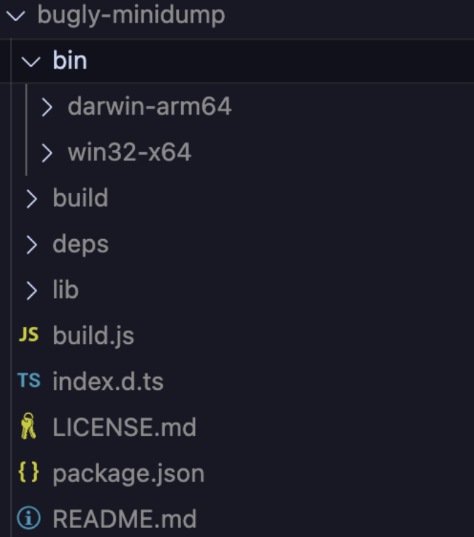 ProjectDir/node_modules/bugly-minidump/bin/ 来设置 minidumpBinDir,如果用户在打包时更改这些可执行文件的路径,需要在初始化时设置 minidumpBinDir。