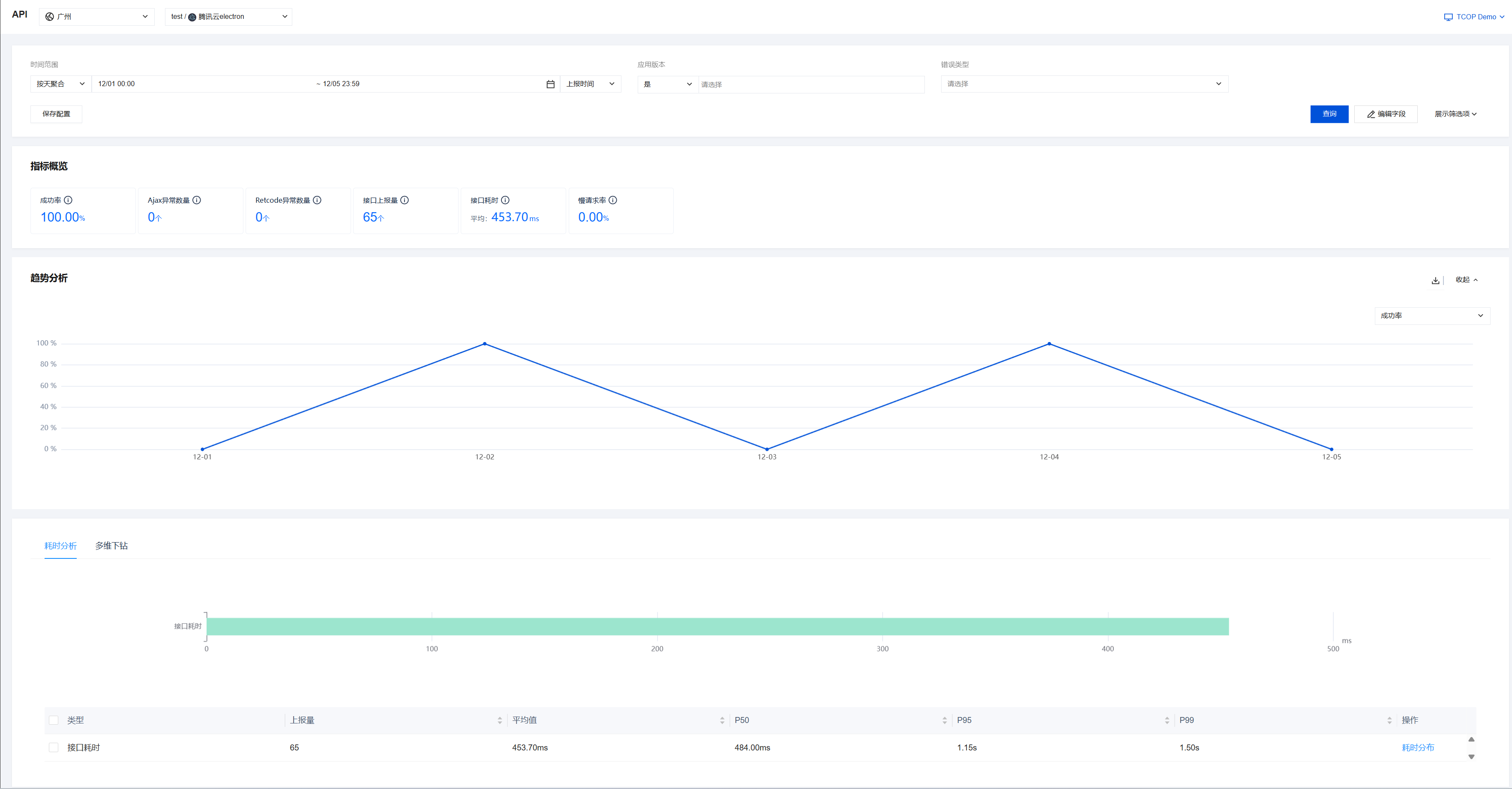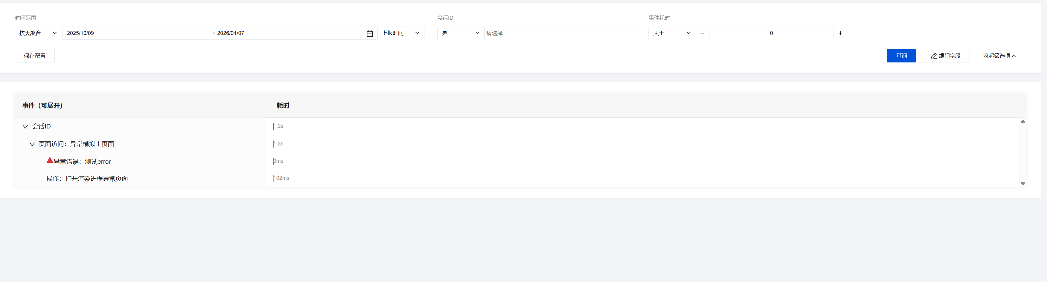aegis.reportTime({name: 'onload', // 自定义测速名称duration: 1000, // 自定义测速耗时(0 - 60000)ext1: 'test1',ext2: 'test2',ext3: 'test3',[key: string]: any,});