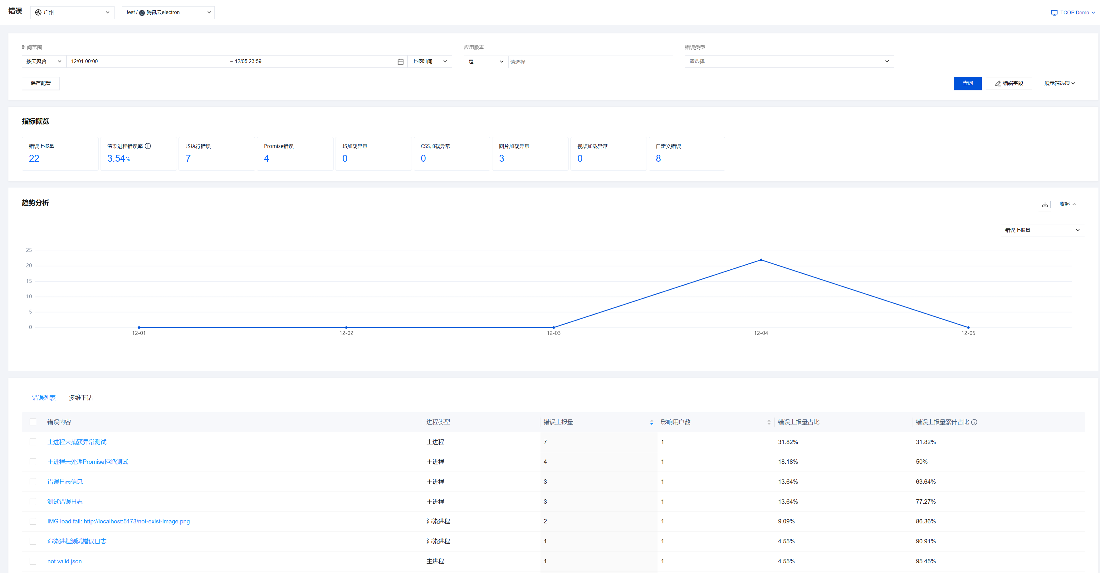 error:捕捉页面的所有错误,包括代码异常、资源请求错误、接口请求错误等信息。上报字段如下: