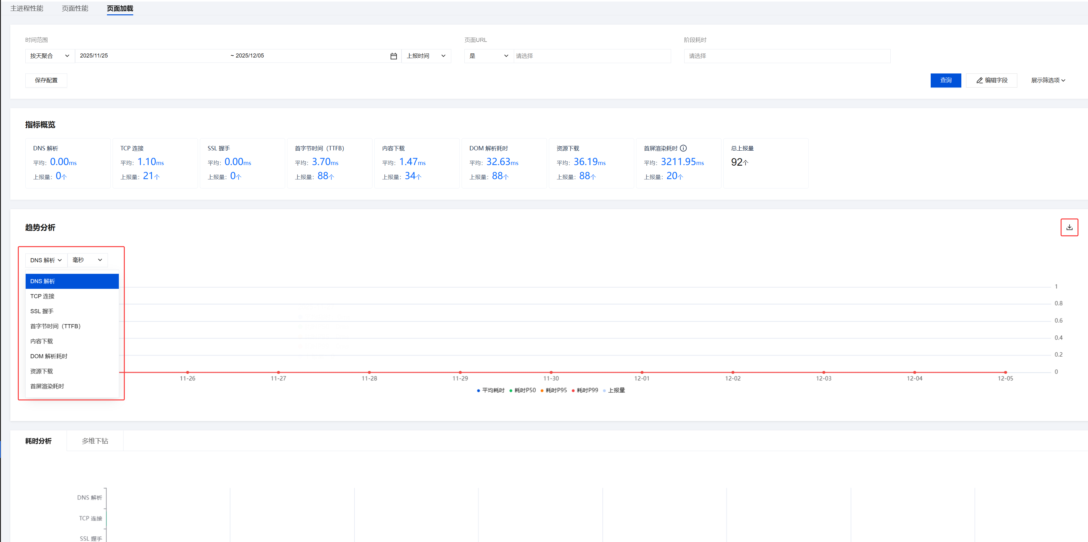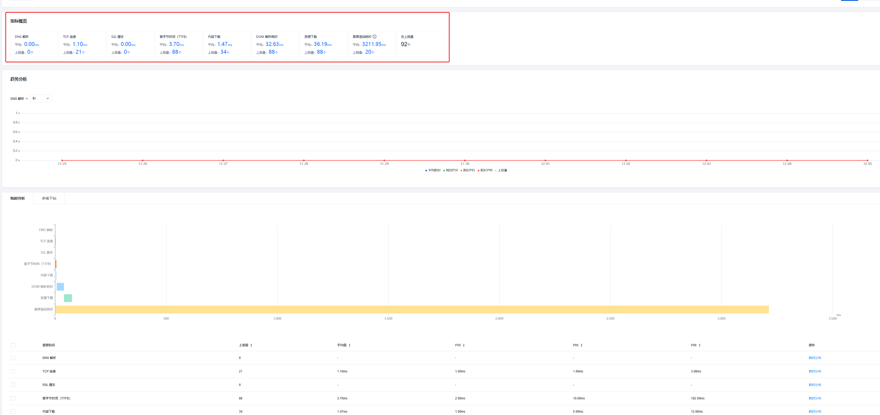 页面解析阶段:DOM 解析耗时、资源下载耗时,反映浏览器解析与资源加载效率,例如下图示例中 DOM 解析平均32.63ms。