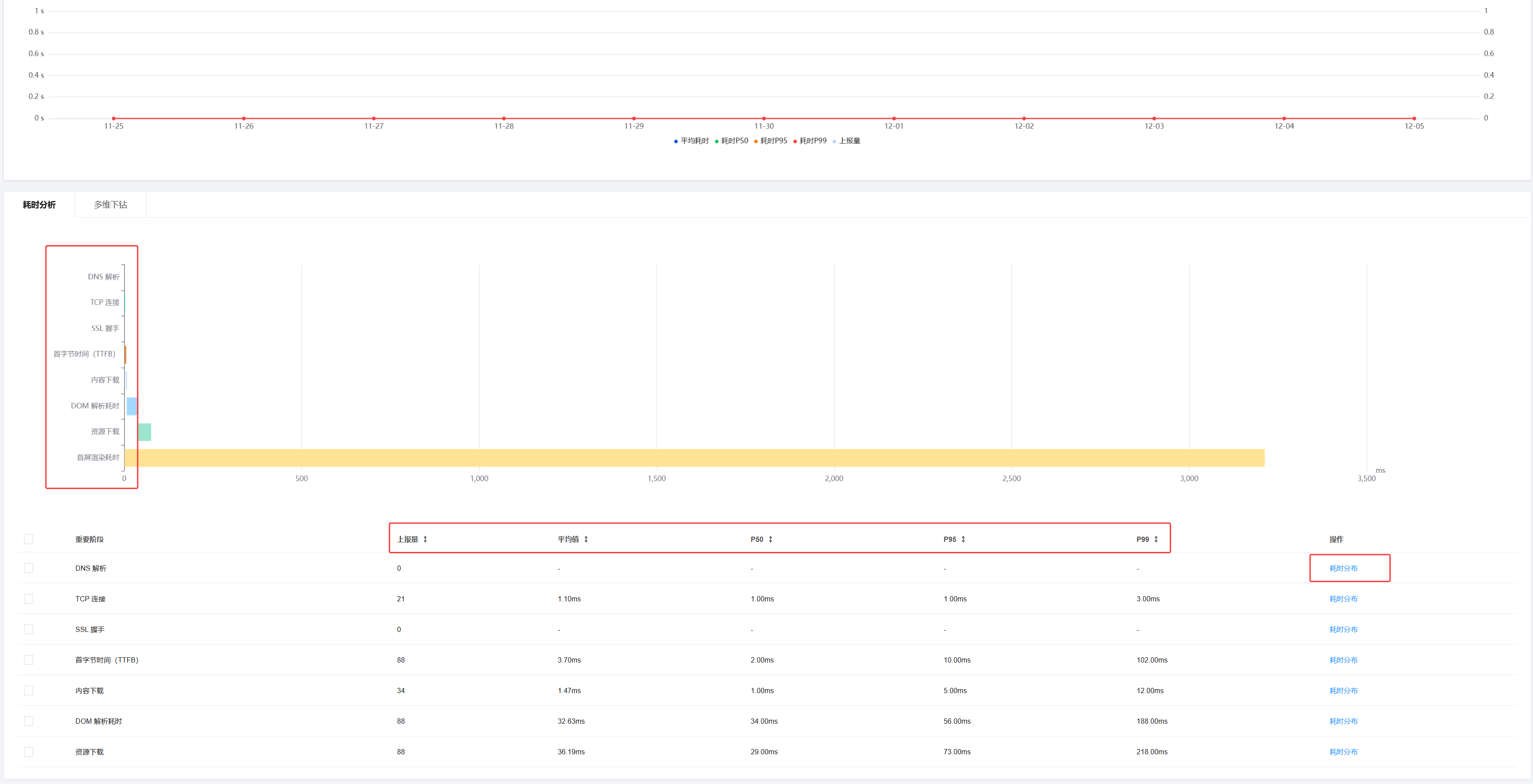 表格详情查看:表格展示各阶段的上报量、平均值、P50/P95/P99分位值。单击耗时分布可进入该阶段的耗时分布详情页,分析不同分位的耗时情况。