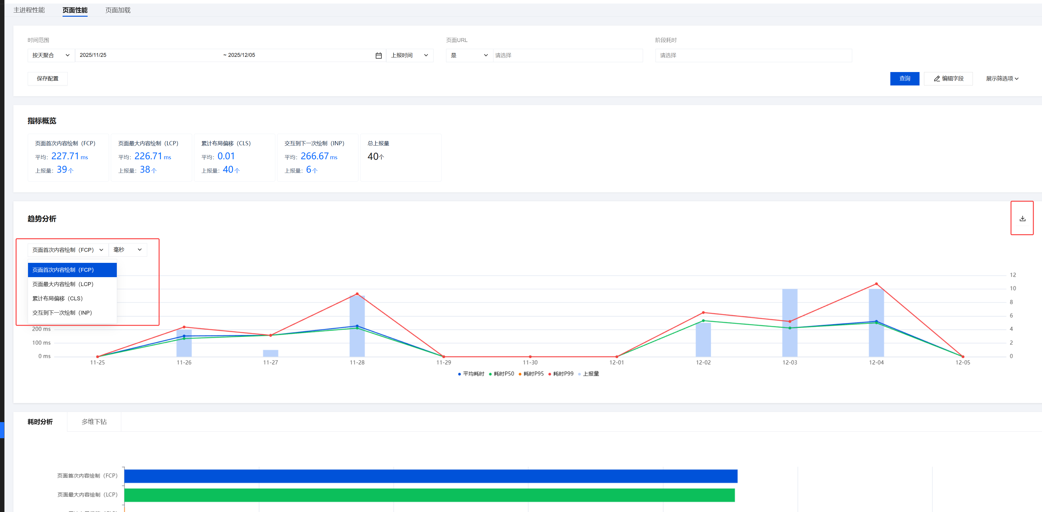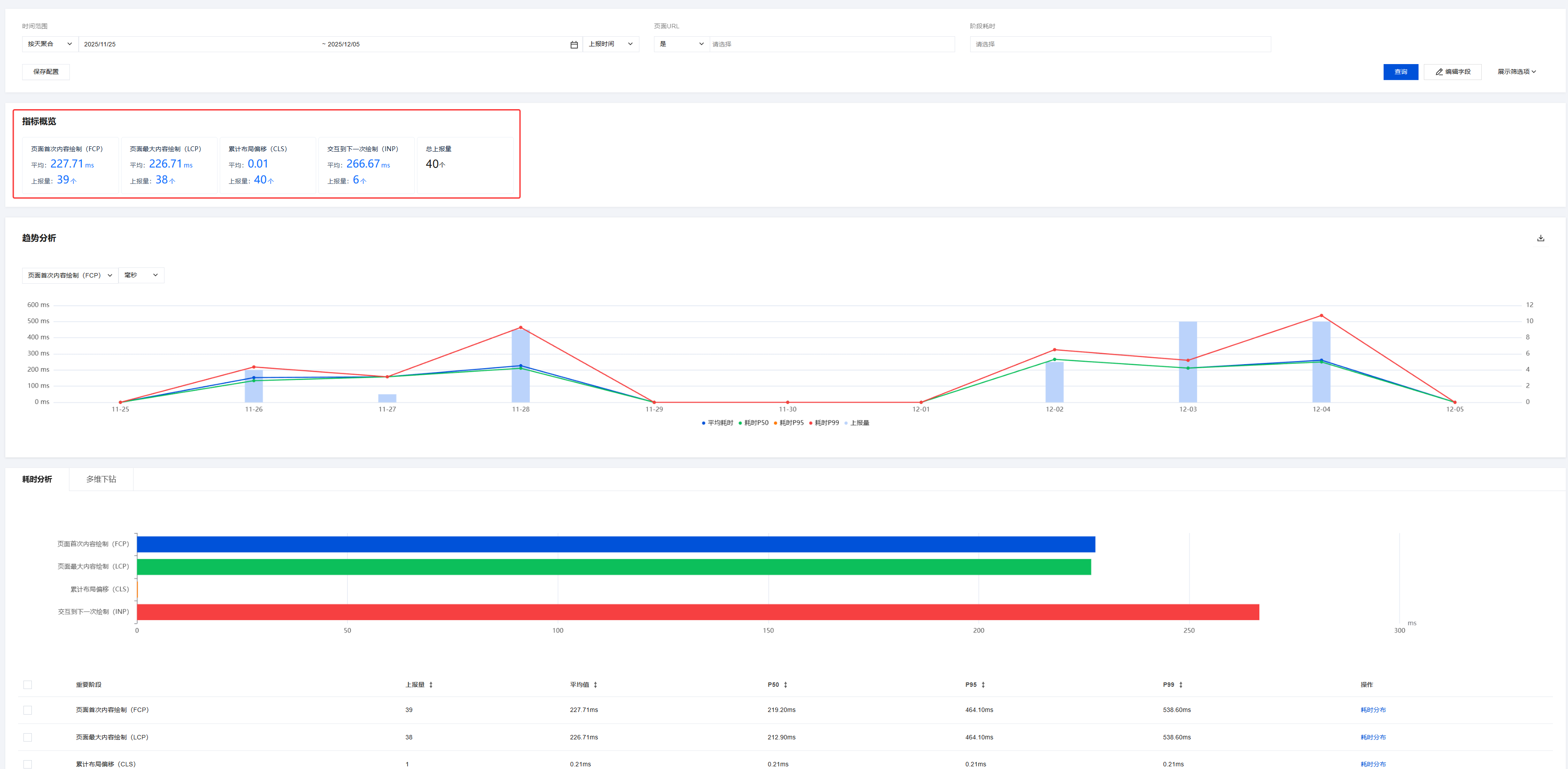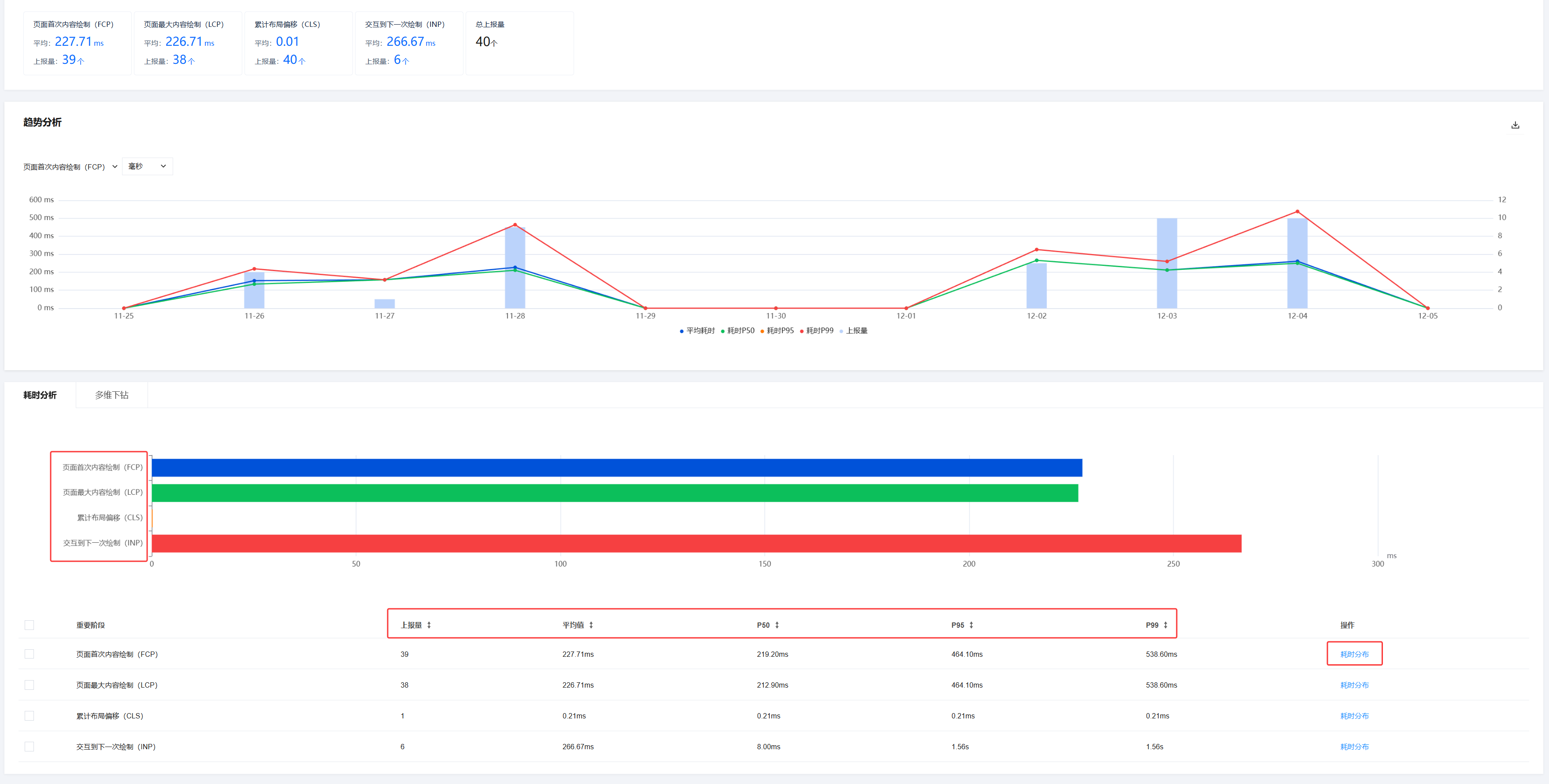 标注说明:图表下方的平均值/P50/P95/P99/上报量对应图表中不同数据点的统计维度。