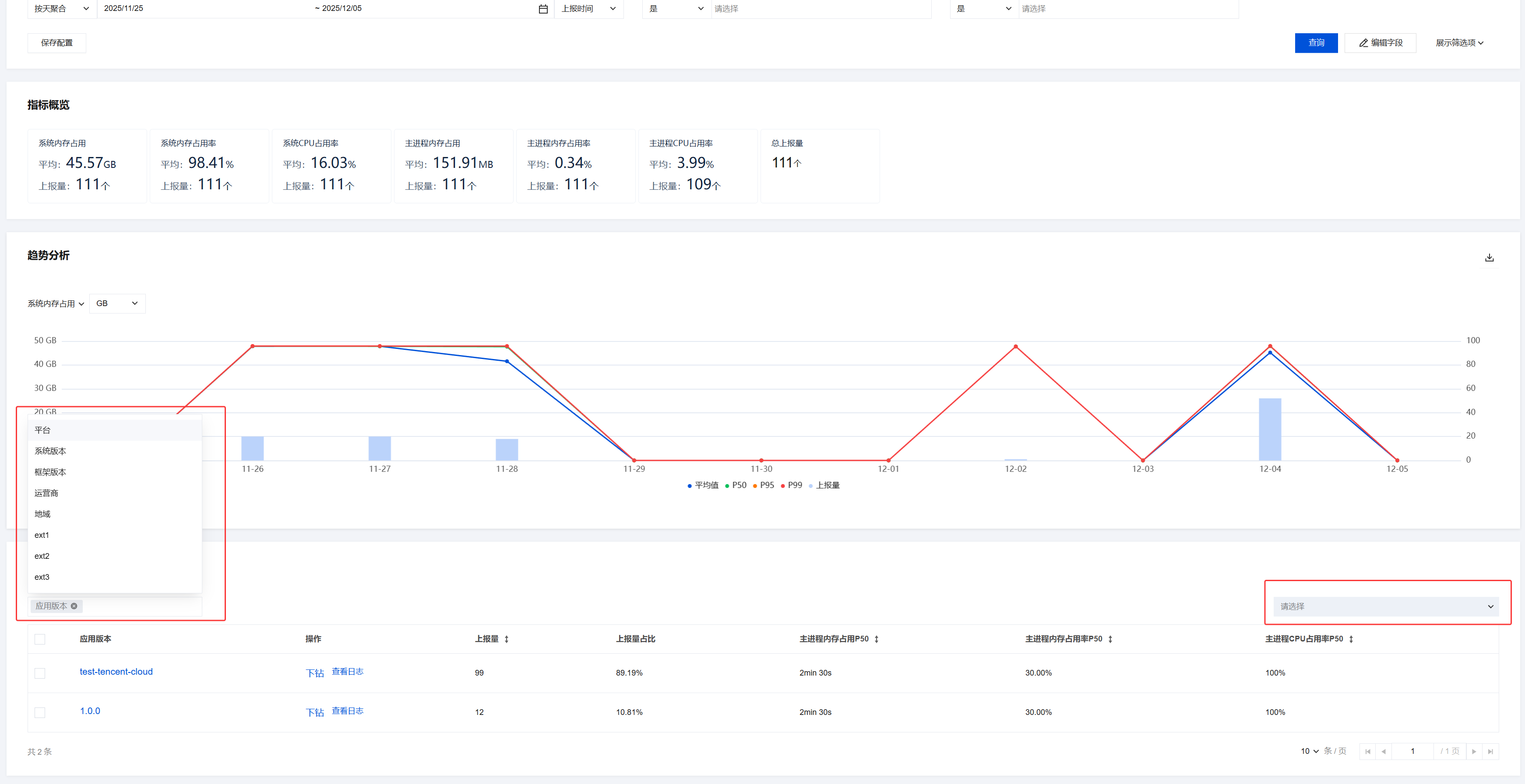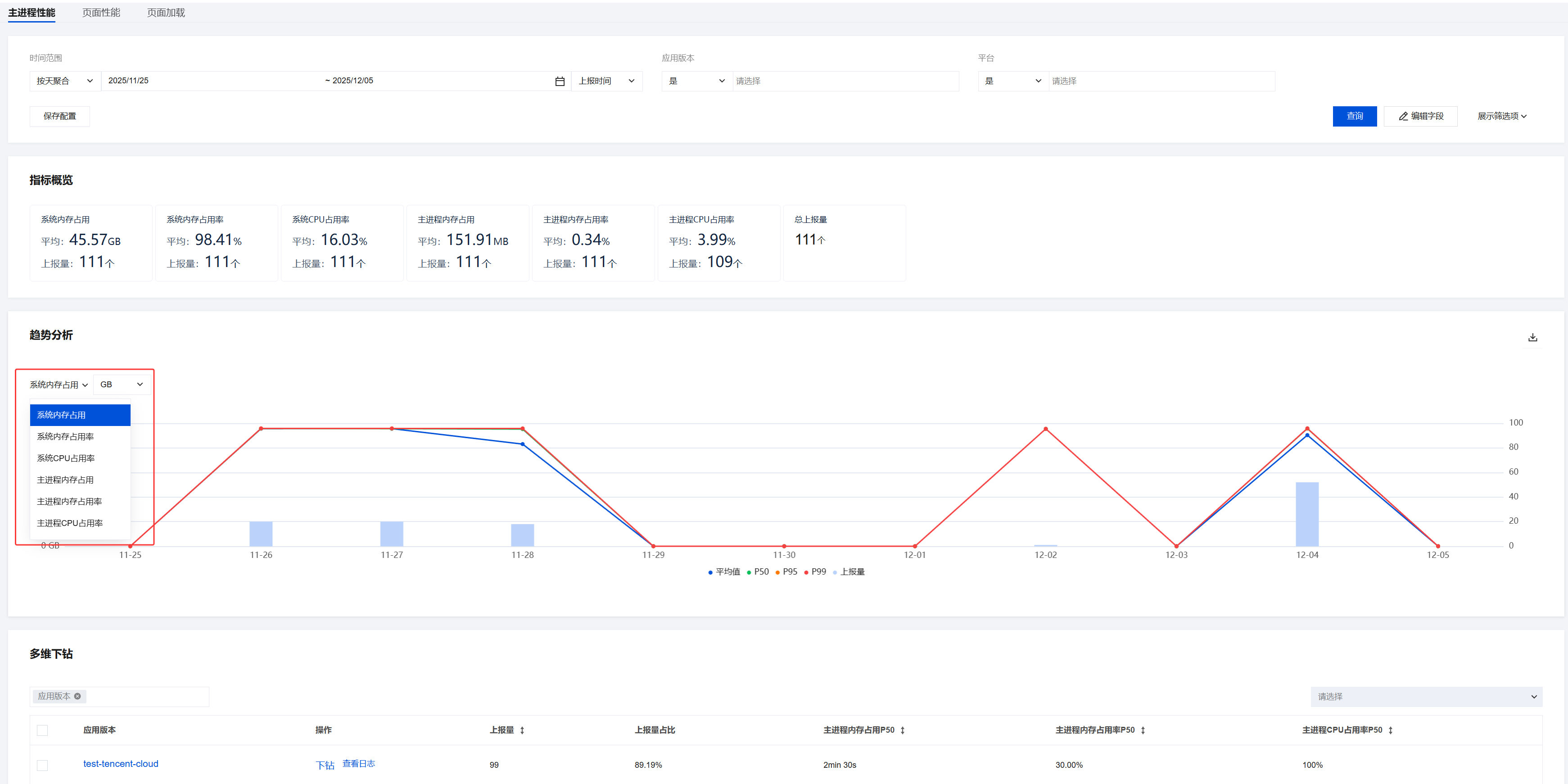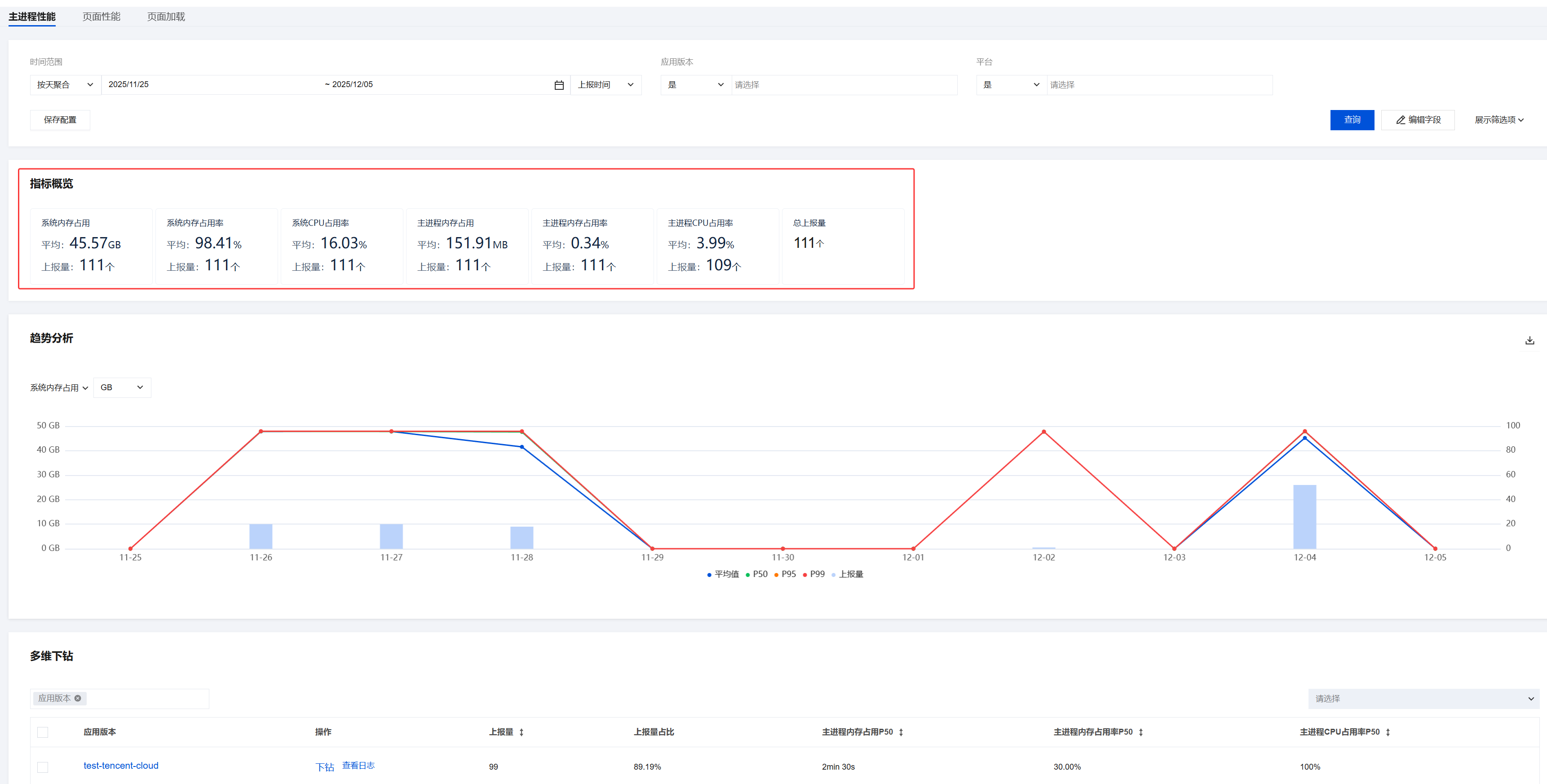 标注说明:图表下方的平均值/P50/P95/P99/上报量对应图表中不同数据点的统计维度。