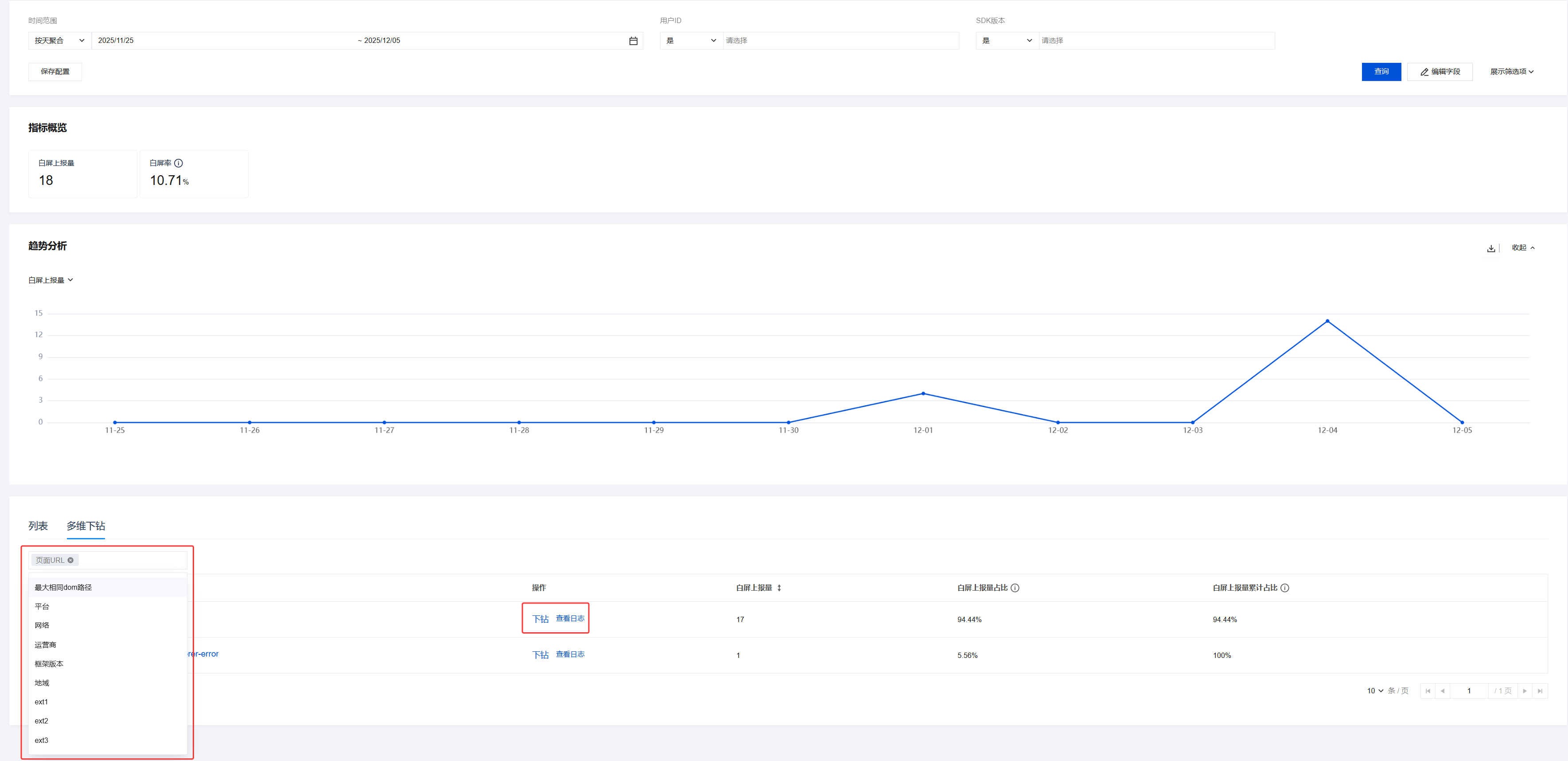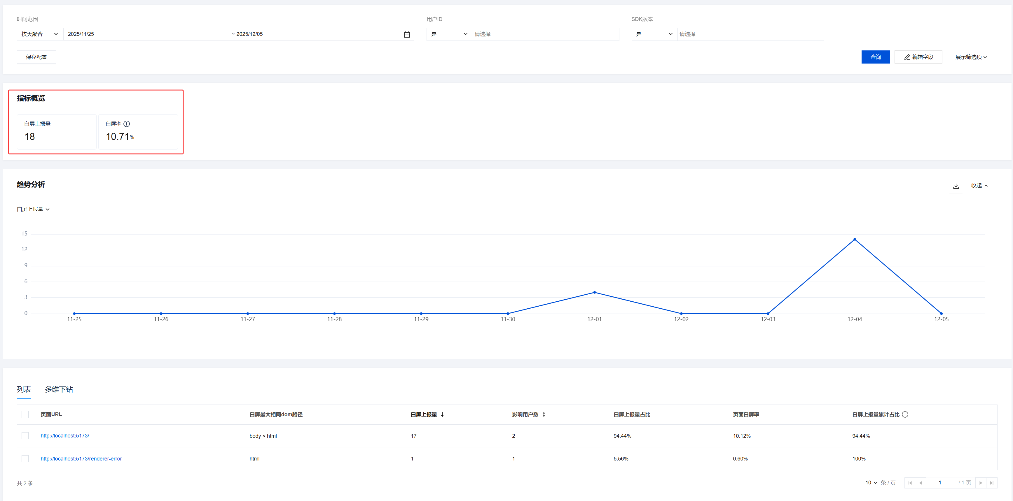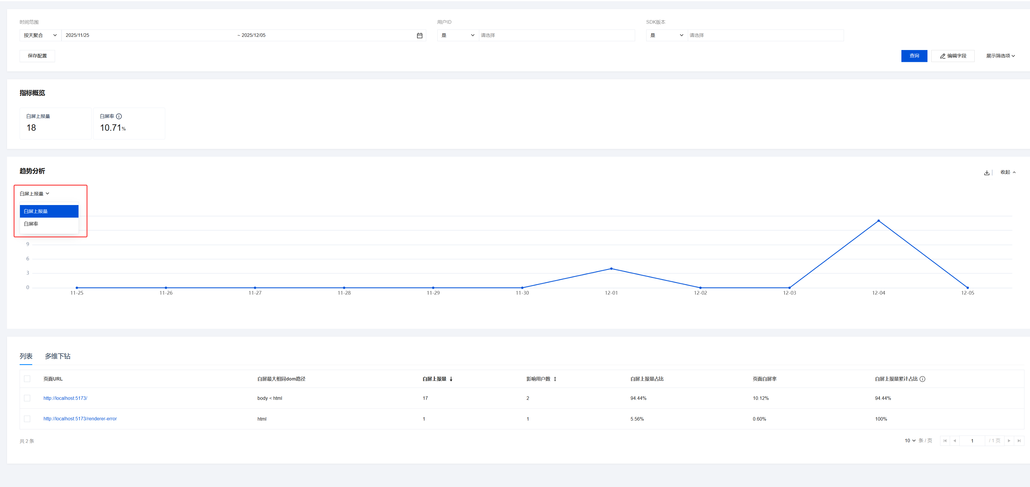 白屏上报量:监测到的白屏事件总次数。