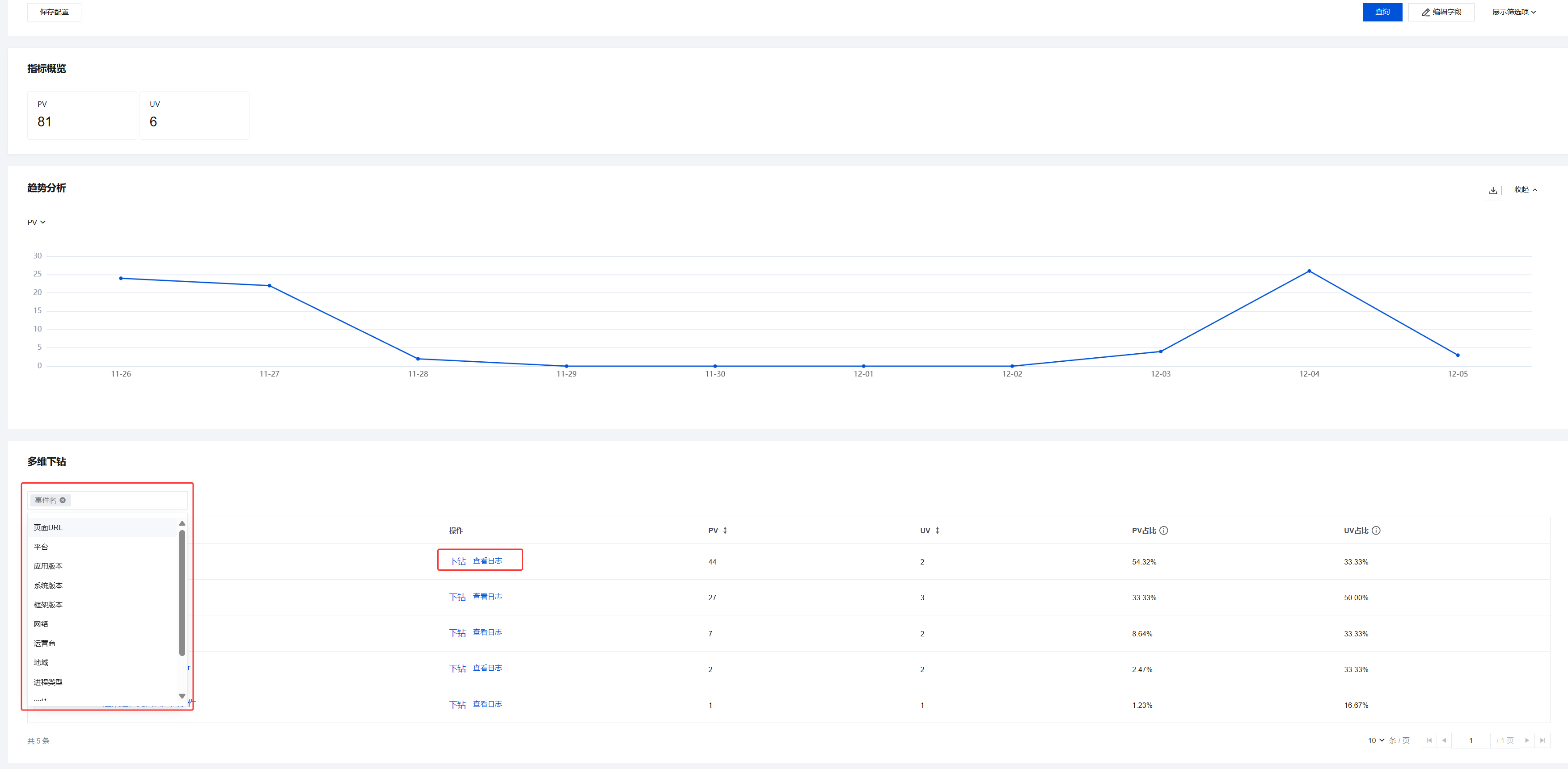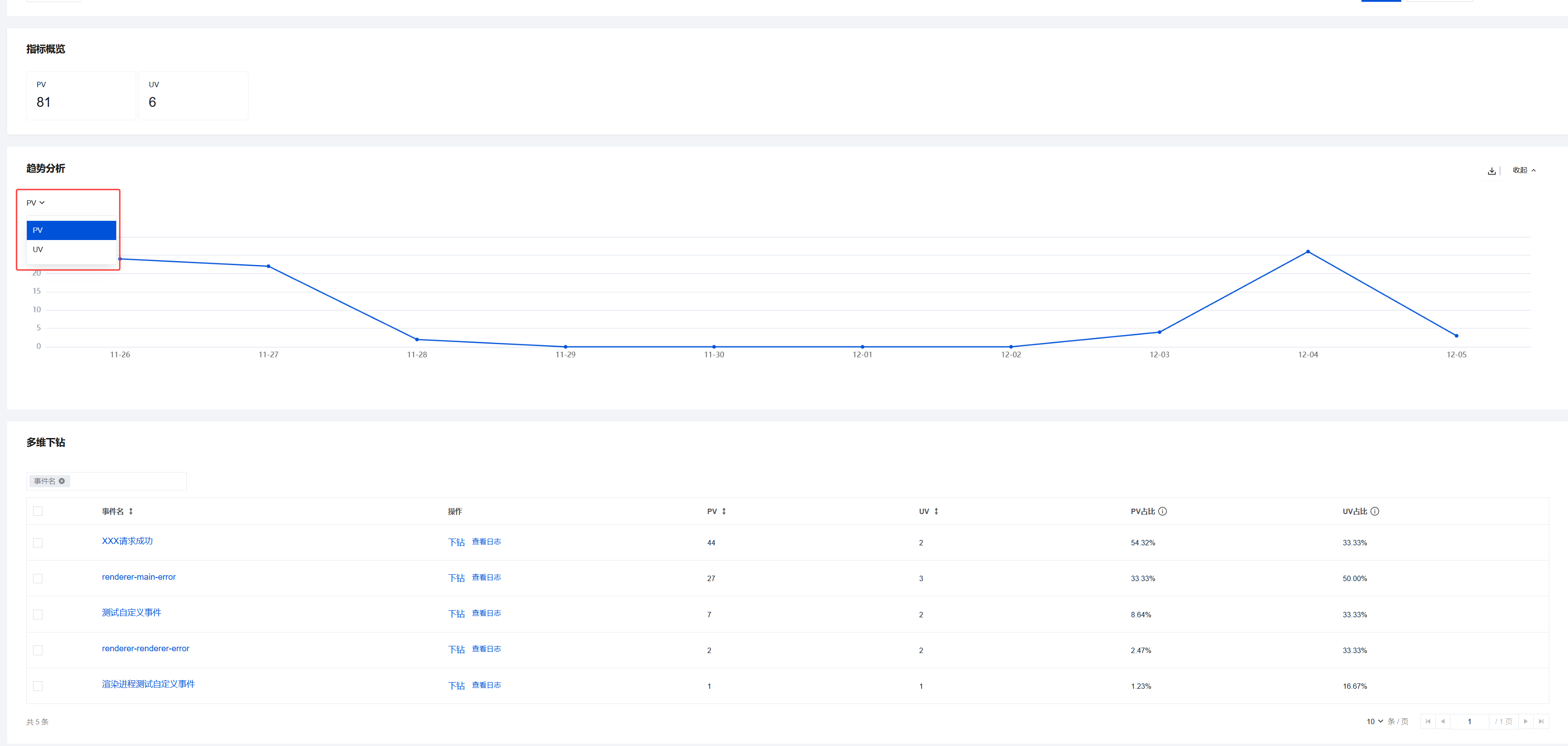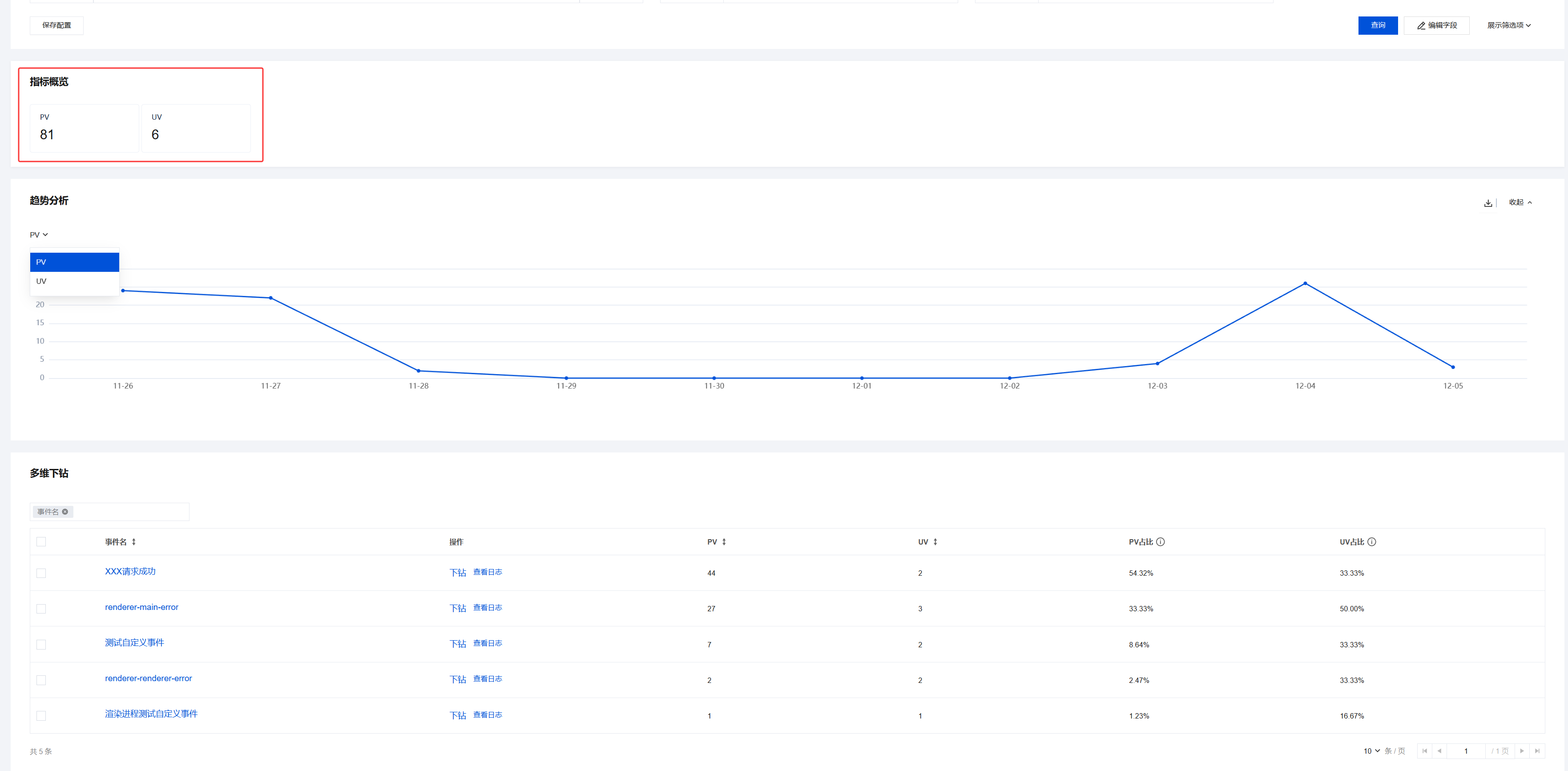 异常识别:若 PV 或 UV 突然激增或某异常事件占比过高,可直接进入趋势分析或多维下钻模块进一步排查。