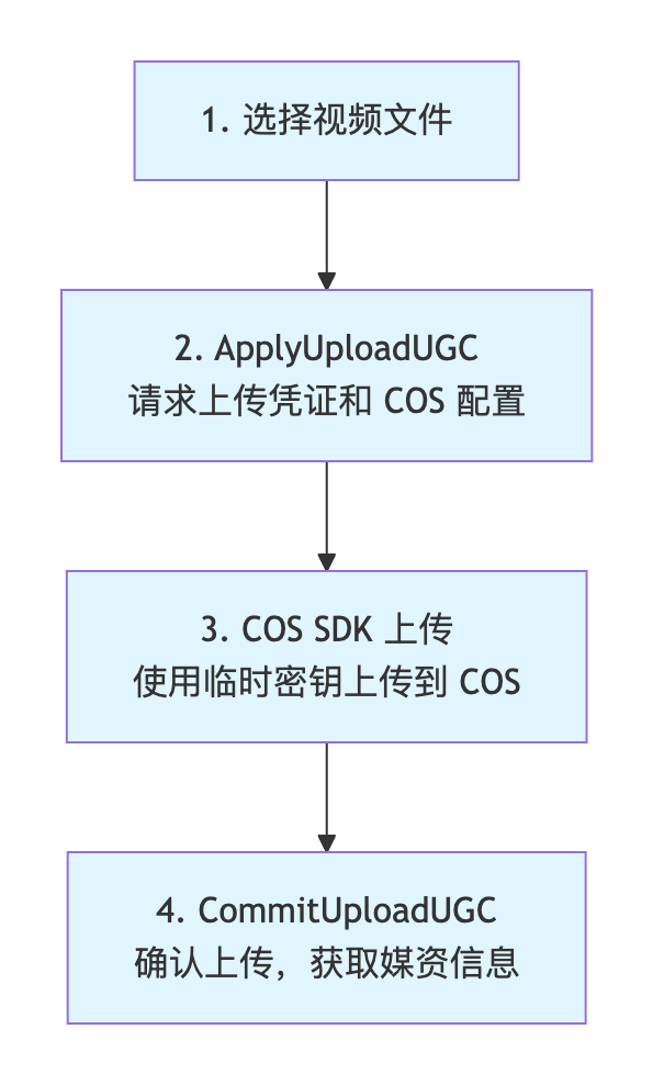 // 解析响应数据const dataJson = response["data"];const certJson = dataJson["tempCertificate"];const videoJson = dataJson["video"];// 构建临时凭证const credential = new QCloudCredential();credential.secretID = certJson["secretId"];credential.secretKey = certJson["secretKey"];credential.token = certJson["token"];credential.startDate = new Date(dataJson["timestamp"] * 1000);credential.expirationDate = new Date(certJson["expiredTime"] * 1000);// 获取上传参数const cosAppId = dataJson["storageAppId"];const cosHost = dataJson["storageBucket"] + "-" + cosAppId;const cosVideoPath = videoJson["storagePath"].replace(/^\\//, ''); // 去除开头斜杠const vodSessionKey = dataJson["vodSessionKey"]; // 保存用于 CommitUploadUGC// 创建上传任务并设置凭证const putRequest = new PutObjectRequest(cosHost, cosVideoPath, localVideoPath);putRequest.credential = credential;const task: UploadTask = CosXmlBaseService.default().upload(putRequest, undefined, new TransferConfig());// 监听上传进度task.onProgress = (progress: HttpProgress) => {const percent = (progress.complete / progress.target) * 100;console.info(`上传进度: ${percent.toFixed(1)}%`);};// 监听上传结果task.onResult = {onSuccess: (request, result: CosXmlUploadTaskResult) => {console.info('上传成功');// 调用 CommitUploadUGCcommitUploadUGC(vodSessionKey);},onFail: (request, error: CosError) => {console.error(`上传失败: ${error.message}`);}};// 开始上传task.start();