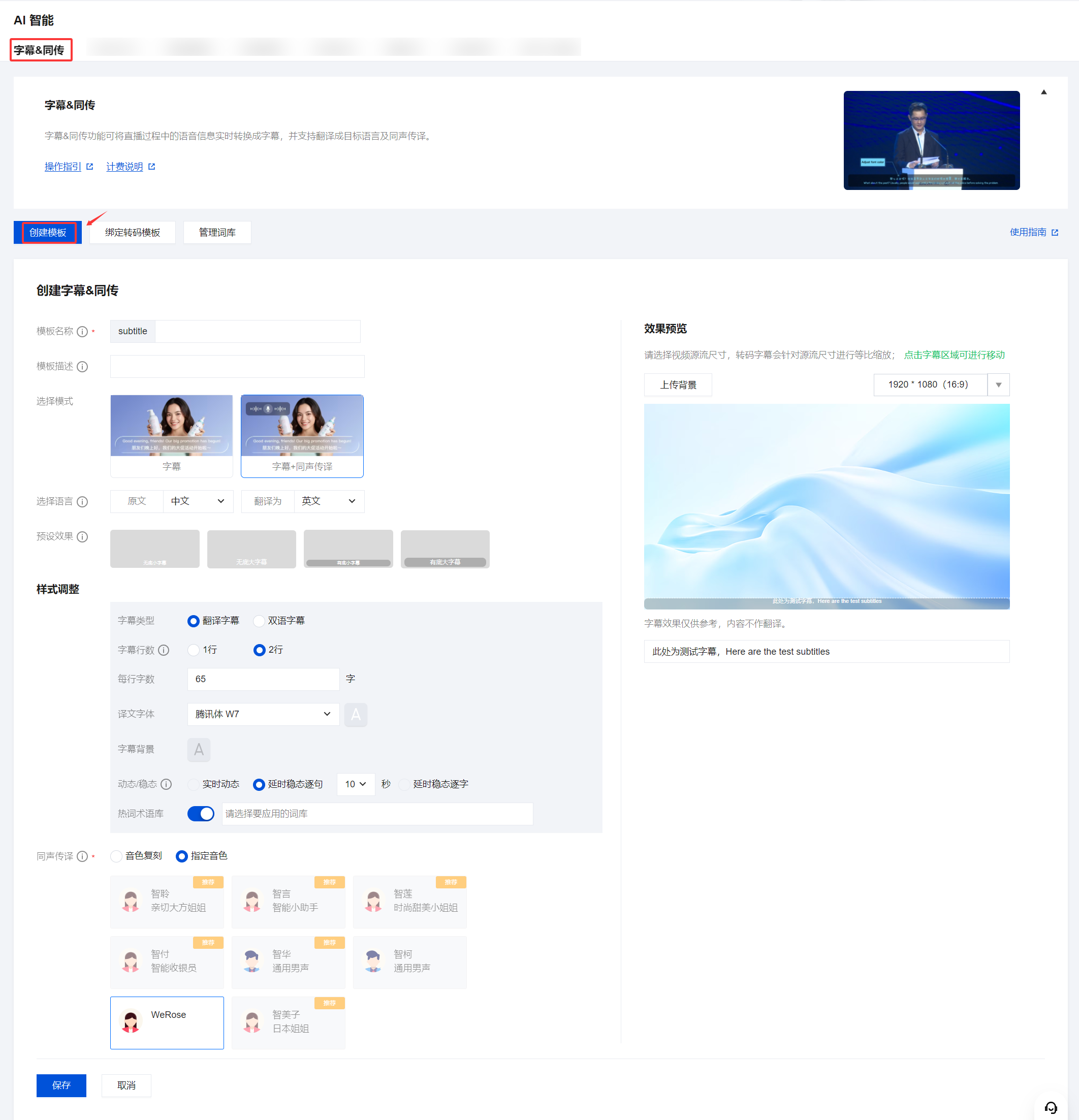 5. 单击创建模板,进入字幕&同传创建页,进行如下配置:
