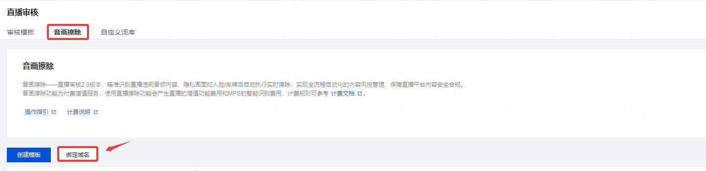 1. 登录 云直播控制台, 进入功能配置 > 直播审核 > 音画擦除。