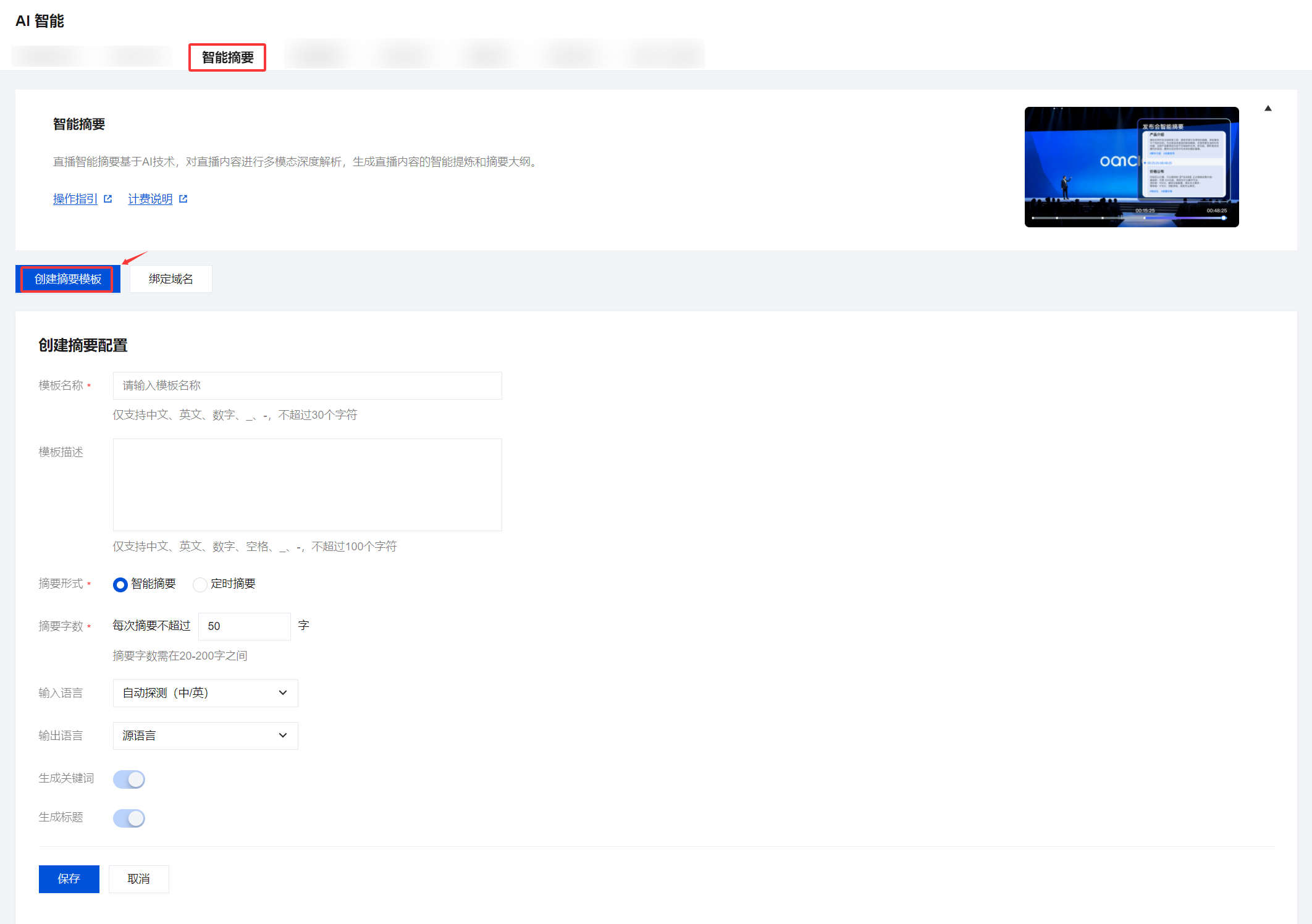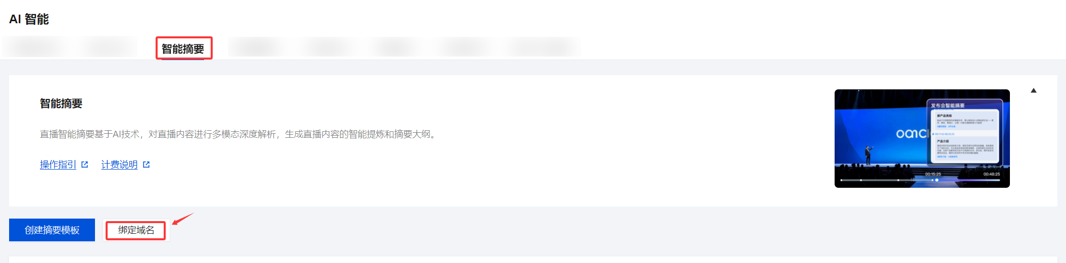 1. 登录 云直播控制台,进入功能配置 > AI 智能 > 智能摘要页面。