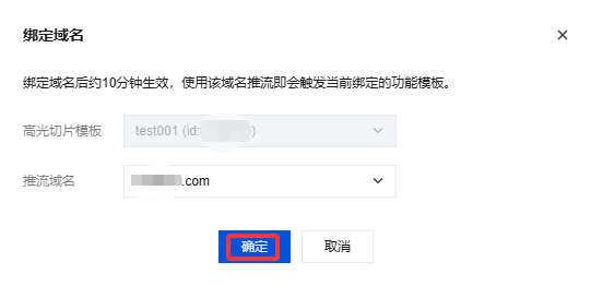 3. 在域名绑定窗口中,选择您需绑定的高光切片模板及推流域名(可同时绑定多个推流域名),单击确定即可绑定成功。