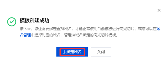 创建高光模板成功后关联域名: 高光模板创建成功后,单击提醒框中的去绑定域名。