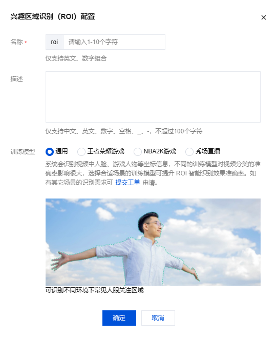 名称 | 模板名称的前缀默认为 "roi"。模板名称可自定义,支持 1-10 个字符,(仅支持英文和数字的组合)。 |