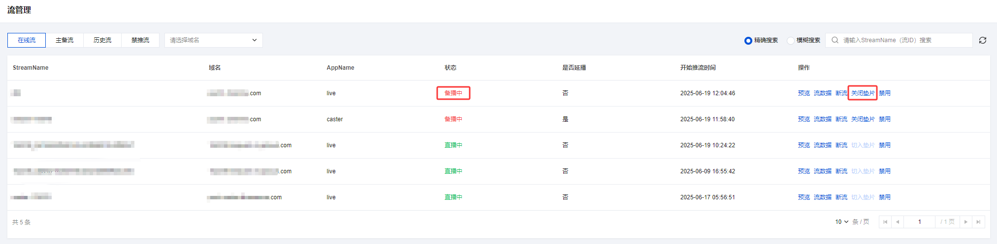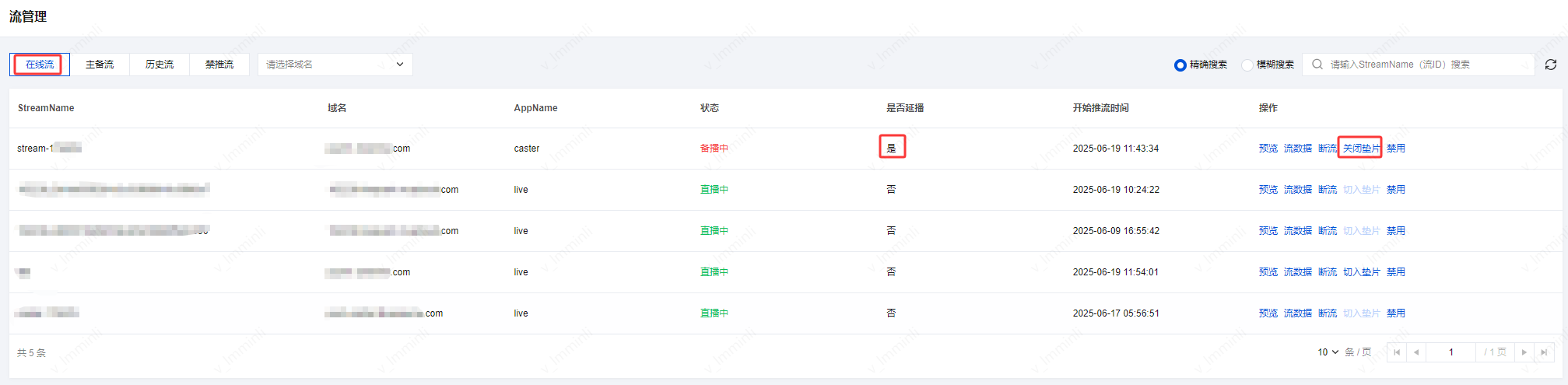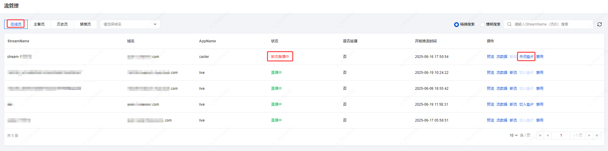 在历史流列表中,可选择待查询的域名与对应的历史直播流。单击禁用即可对该历史直播流进行禁用。