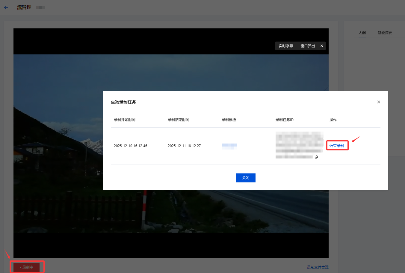 针对录制中的直播流,您可单击录制中,查询录制任务信息,包括录制开始时间、录制结束时间、录制模板、录制任务ID。如需提前结束录制,请单击结束录制对直播流手动停止录制。若未手动停止录制,系统将在录制结束时间到期时自动停止录制。
