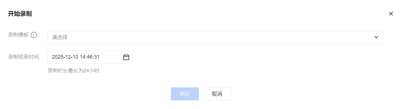 单击预览进入直播页面后,继续单击开始录制,根据弹窗提示,您可以选择录制模板(仅支持选择录制至 VOD 的模板)和录制结束时间(录制时长最长为24小时),并发起针对直播流的单流录制能力。