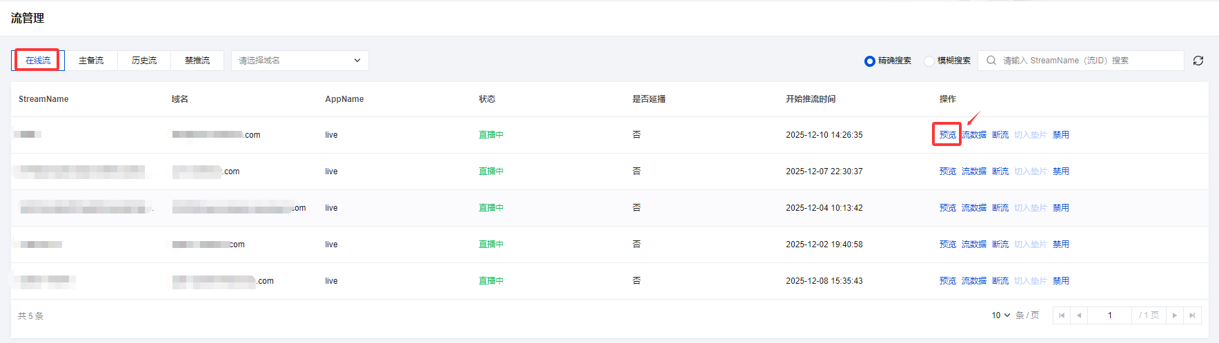在线流列表中,可选择待查询的域名与对应的在线流。单击右侧的预览可查看实时直播画面、高光切片和智能摘要信息。