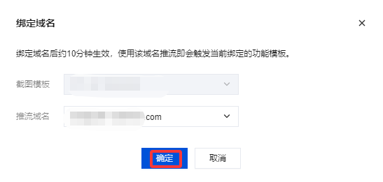 3. 在域名绑定窗口中,选择您需绑定的截图模板及推流域名(可同时绑定多个推流域名),单击确定即可绑定成功。