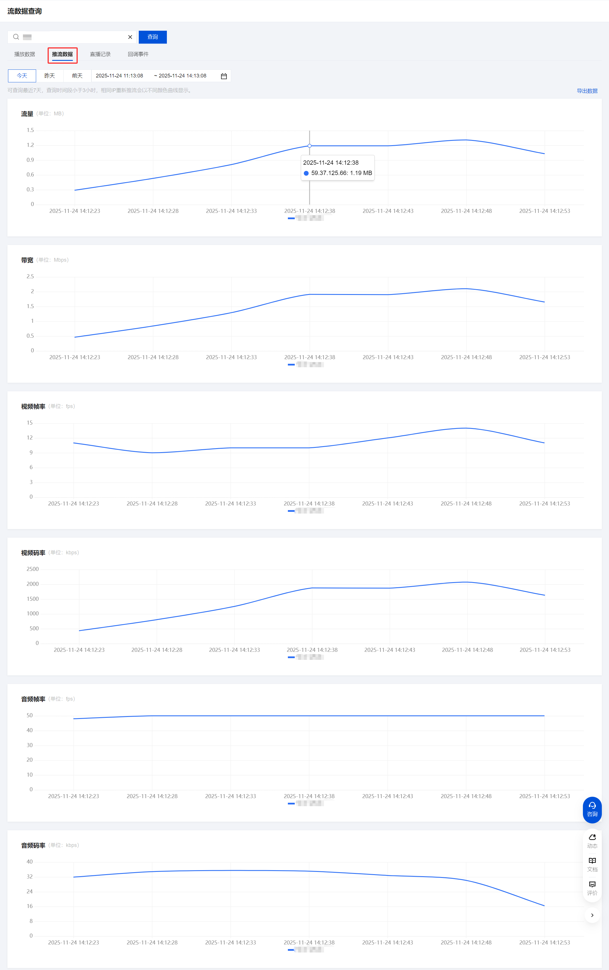 推流数据可查询单条流的流量、带宽、视频帧率、视频码率、音频帧率和音频码率的数据,可查询最近7天,查询时间段小于3小时,相同 IP 重新推流会以不同颜色曲线显示。