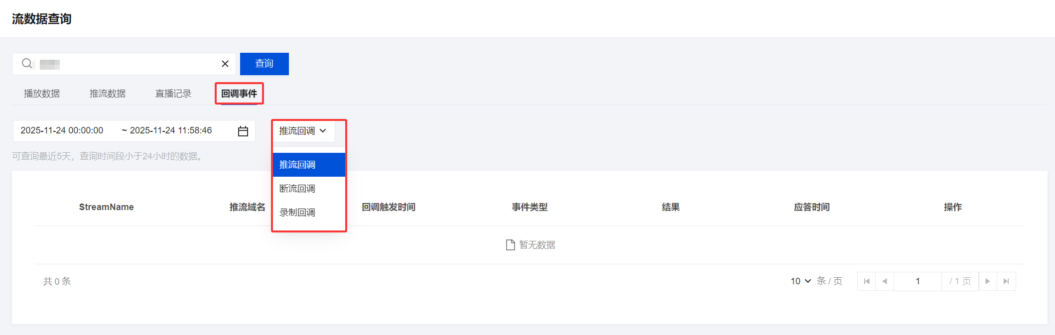 回调事件可查看直播流推流回调、断流回调和录制回调,各类回调事件的流名称、推流域名、回调触发时间、应答时间和回调结果,当回调结果显示失败状态,可单击查看排查回调事件失败的原因。回调事件可查询最近5天,查询时间段小于24小时的数据。