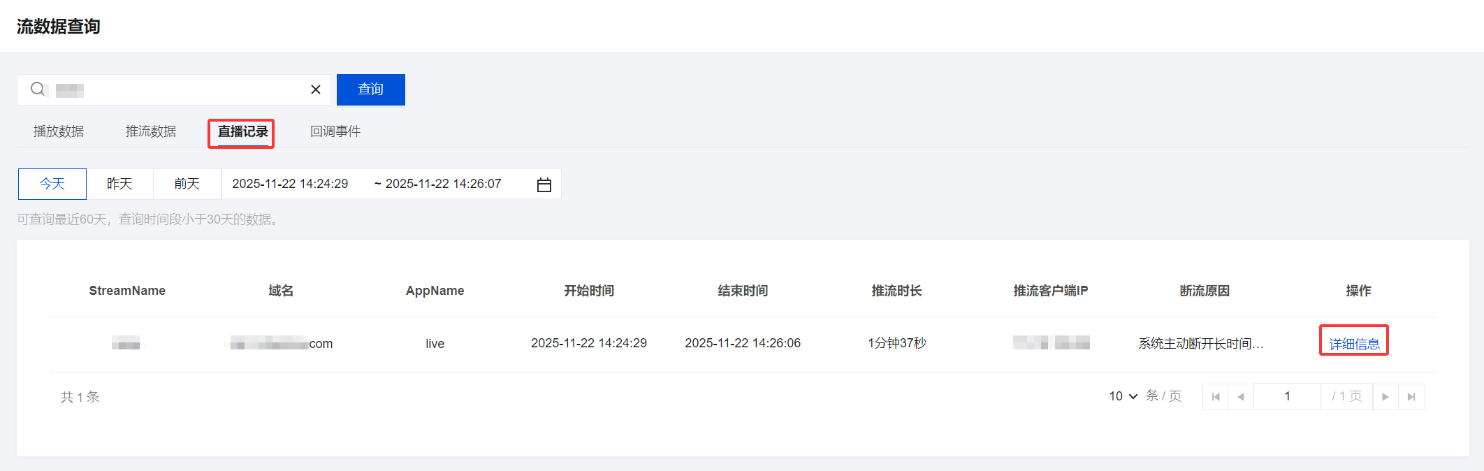 直播记录页面可查看关于直播流的流名称、推流域名、直播应用名称、开始/结束时间、推流时长和推流客户端 IP(显示为“-”代表该直播流是拉流转推模块推的流),还可单击详细信息查看推流数据。直播记录可查询最近60天,查询时间段小于30天的数据。
