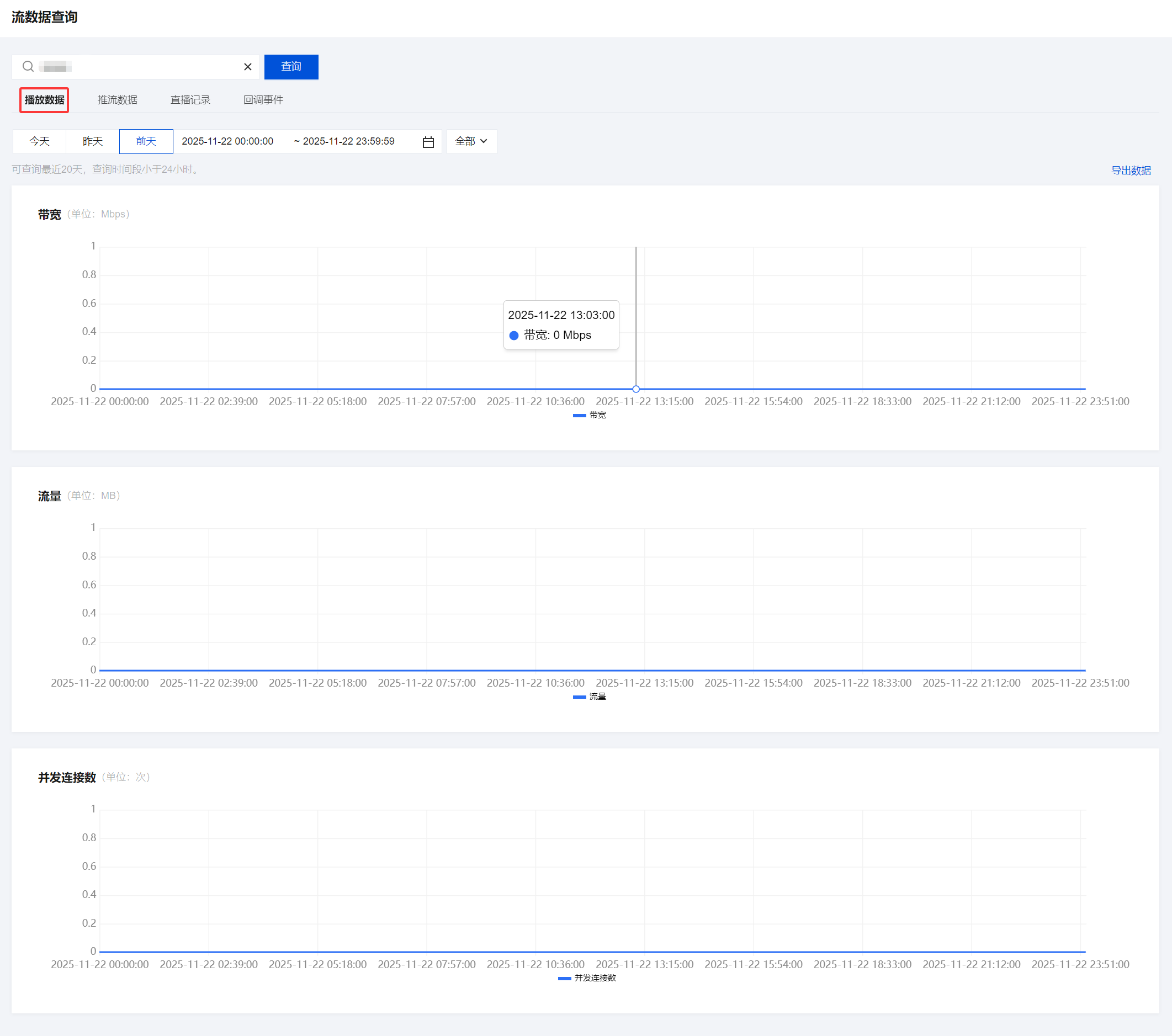播放数据页面可查看带宽、流量和并发连接数的数据。播放数据查询只能查询最近20天,查询时间段小于24小时。