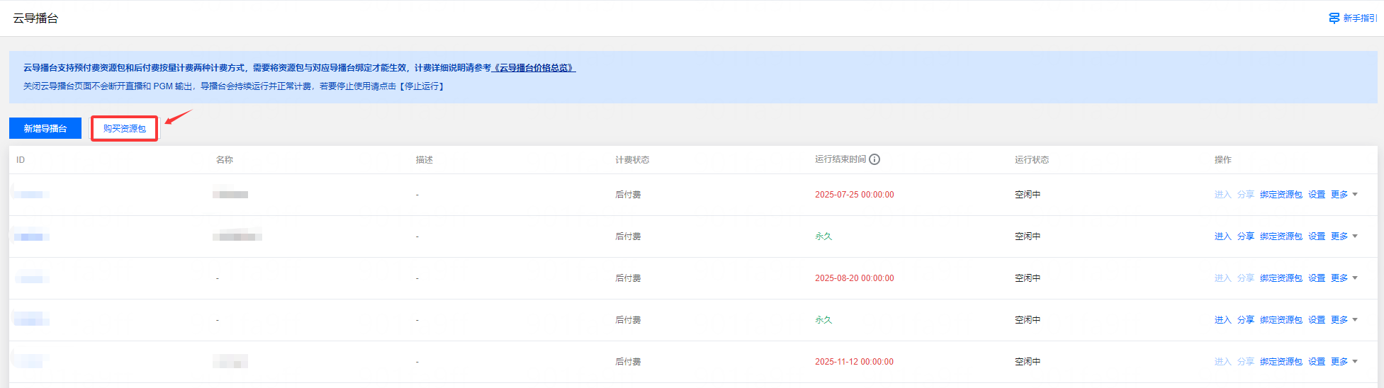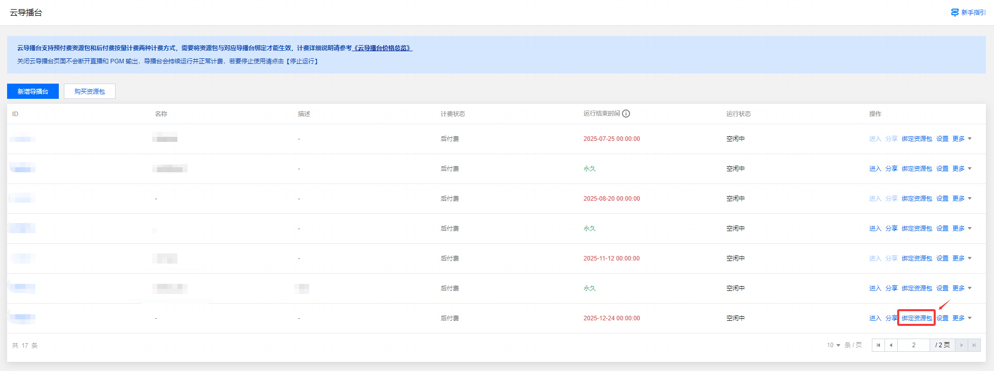 1. 根据您的业务需求,云导播可以绑定资源包。单击绑定资源包进入设置页面。