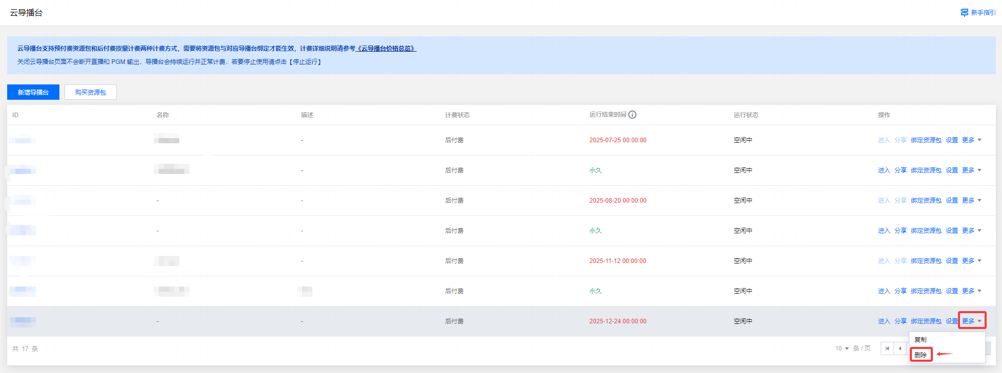 1. 在您想删除的导播台中的操作栏中单击更多 > 删除,即可进行删除导播台操作。