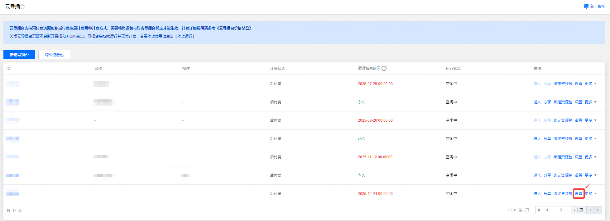 2. 若您需修改导播台信息,可单击对应导播台操作栏的设置,进入导播台设置页。