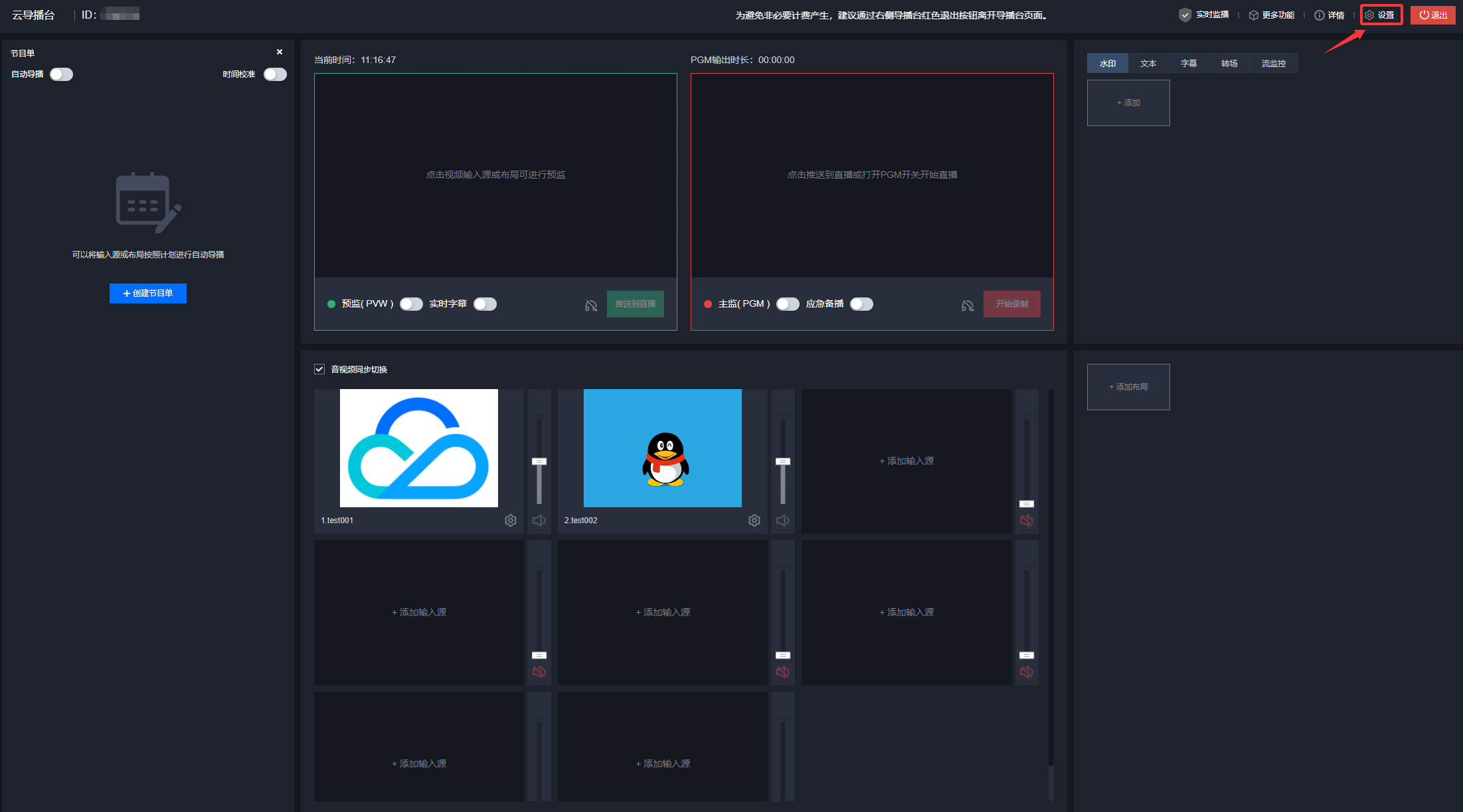 云导播台支持叠加多个水印。若您需在导播画面中添加水印,具体操作步骤如下: