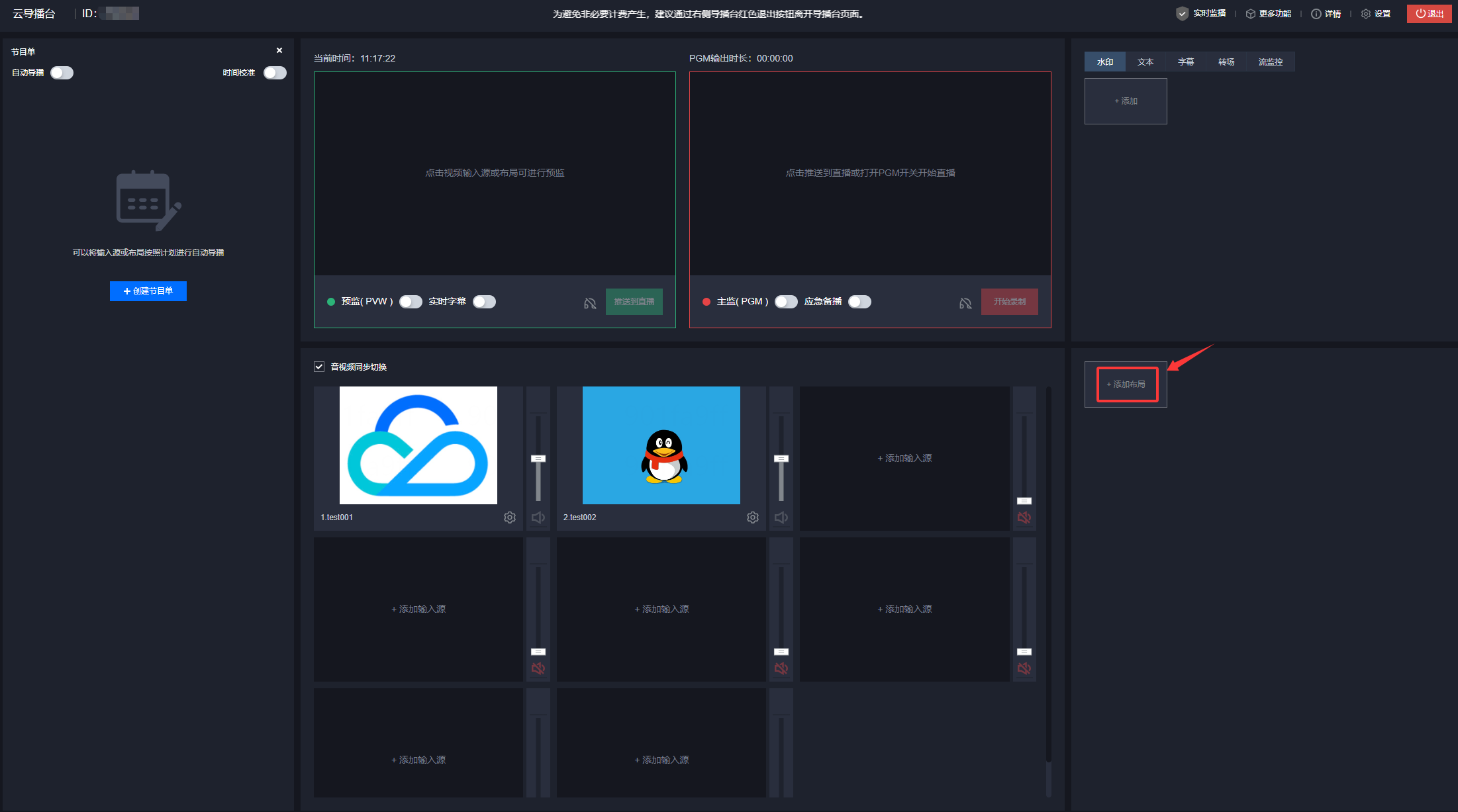 导播编辑主要包含配置布局、音频处理、添加水印、添加备播视频和图片和创建节目单等功能,可以丰富您的直播内容。