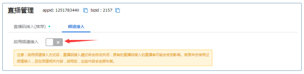 如果您在开启直播码模式之后,发现它可能并不是特别适合您,您还可以会退到频道托管模式,做法很简单:只需要在频道接入页签卡中点击“启用频道接入”按钮即可。