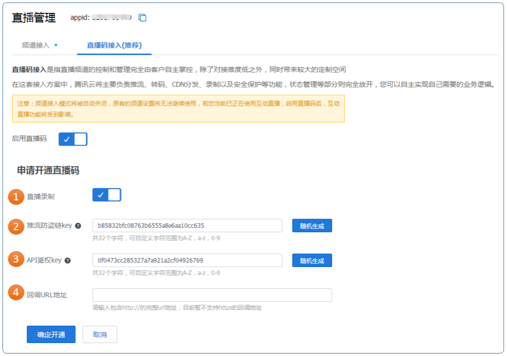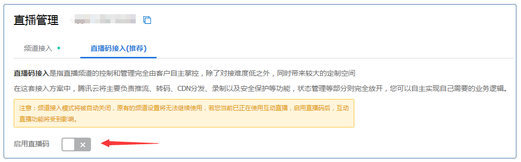 点击启用直播码按钮后,您会看到一个兼容性提醒Tips,如果您的线上业务有依赖频道托管模式不推荐开启,之后进入配置界面: