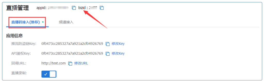 点击直播码接入(推荐) 页签卡,则可以看到开启直播码服务的开关:
