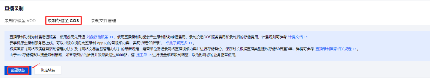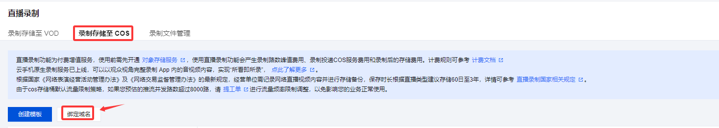 新录制模板创建成功后关联域名:录制模板创建成功后,单击提醒框中的去绑定域名。