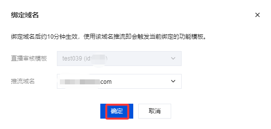 3. 在域名绑定窗口中,选择您需绑定的直播审核模板及推流域名(可同时绑定多个推流域名)单击确定即可绑定成功。