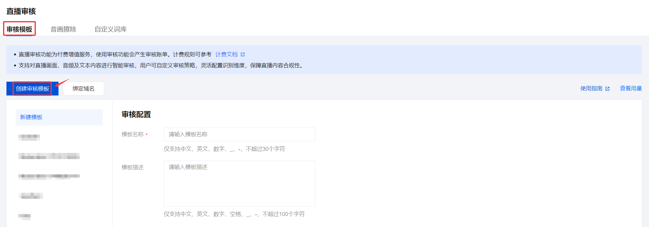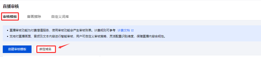 新审核模板创建成功后关联域名:审核模板创建成功后,单击提醒框中的去绑定域名。