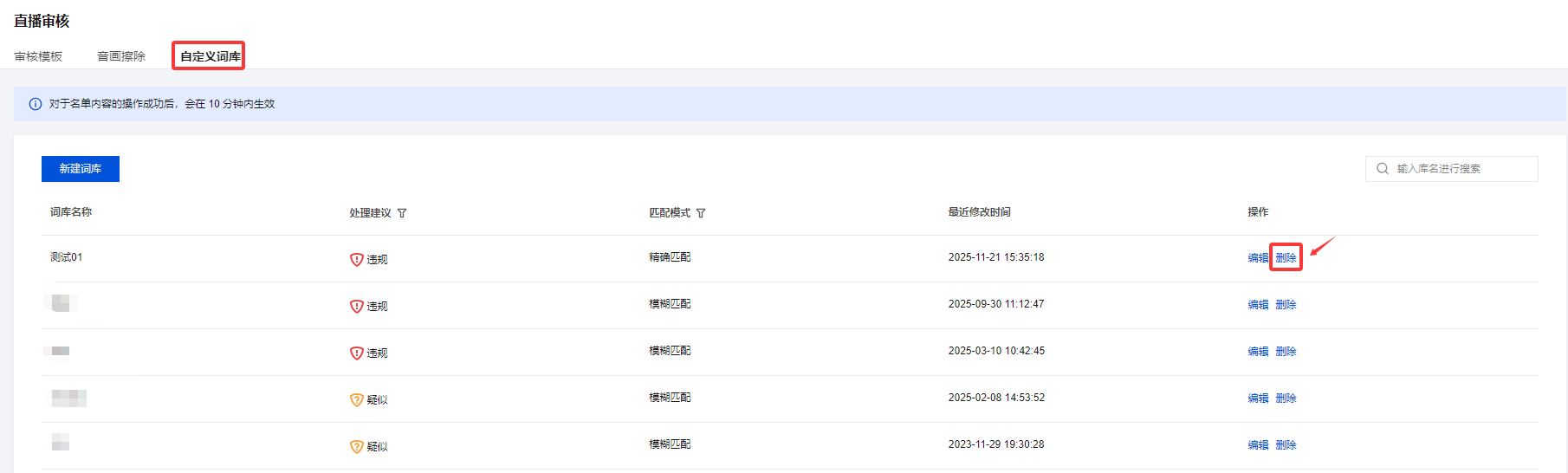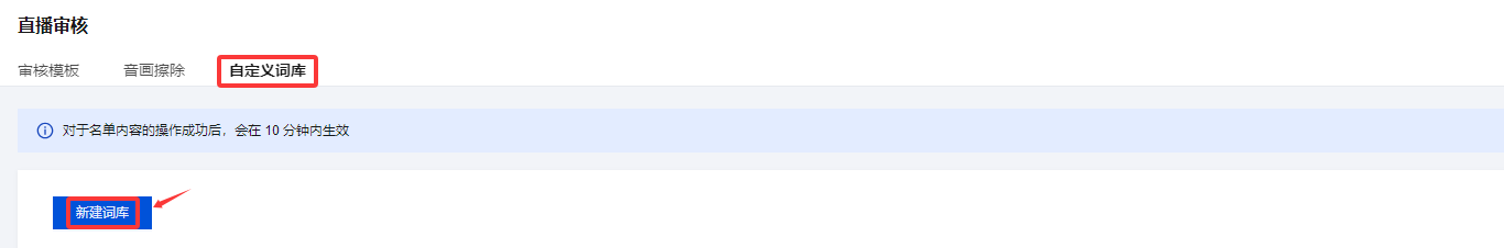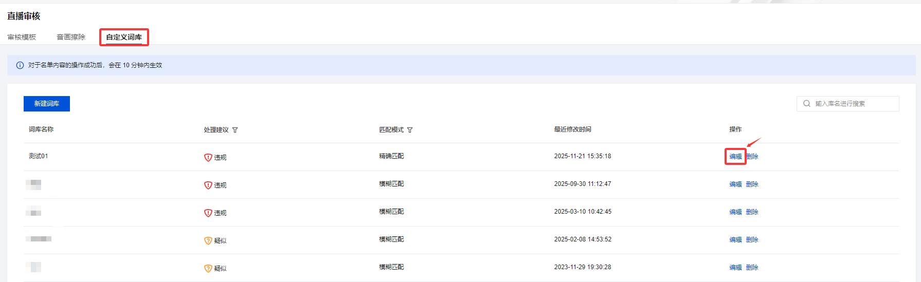 直播画面和音频审核可以通过绑定自定义词库,对特定词条进行个性化识别,并设置绿色放行或违规打击。设置成功后,词库内容将在10分钟内生效。