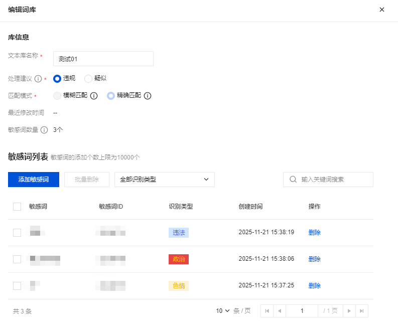 2. 单击添加敏感词,然后在弹窗中添加样本,结合业务需求添加敏感词。