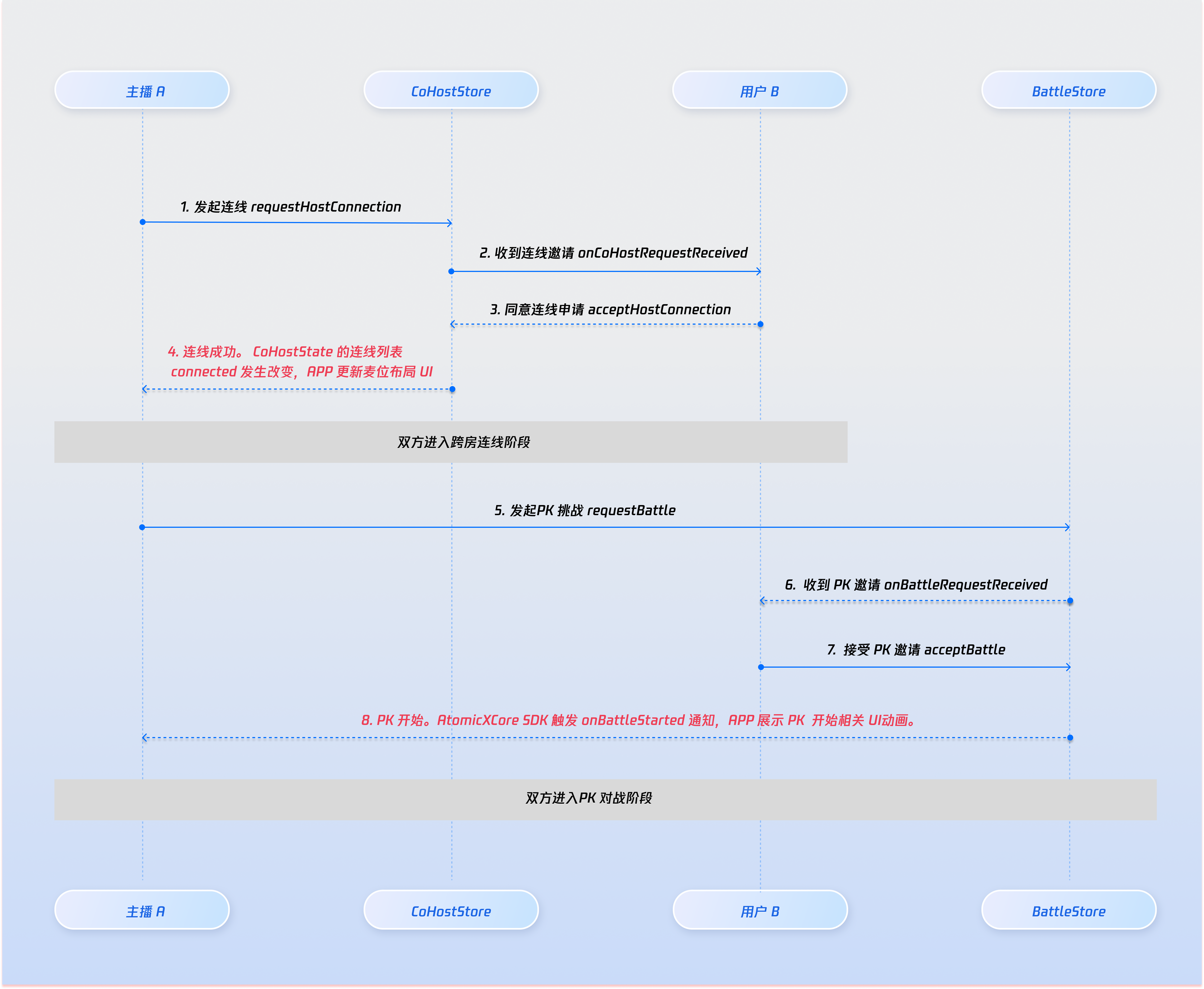 AtomicXCore 提供了 CoHostStore 和 BattleStore 两个模块,分别用于处理跨房连线和 PK 对战。本文将指导您如何组合使用这两个工具,完成语聊房场景下的连线和 PK 功能的开发。
