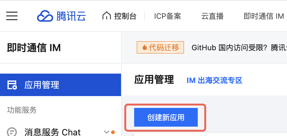 1. 登录 即时通信 IM 控制台。如果您已有应用,请记录其 SDKAppID 和密钥信息。