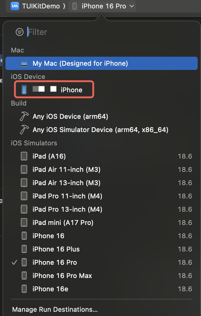TUIKitDemo.xcworkspace 编译运行。以运行 iOS 设备为例: