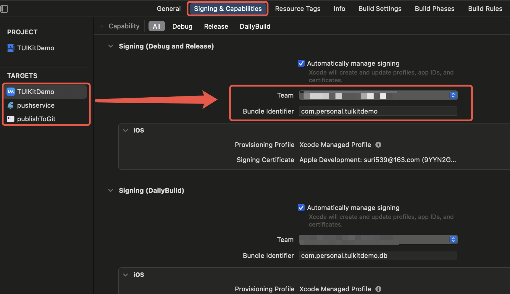 3. 在项目 TARGETS 的 Signing & Capabilities 界面勾选 Automatically manage signing,然后在每一个 Target 下配置您的苹果开发者账号和 Bundle Identifier。如果尚未在 Xcode 中登录 Apple ID,请先在 Xcode > Preferences > Accounts 中添加您的开发者账号或 Apple ID。