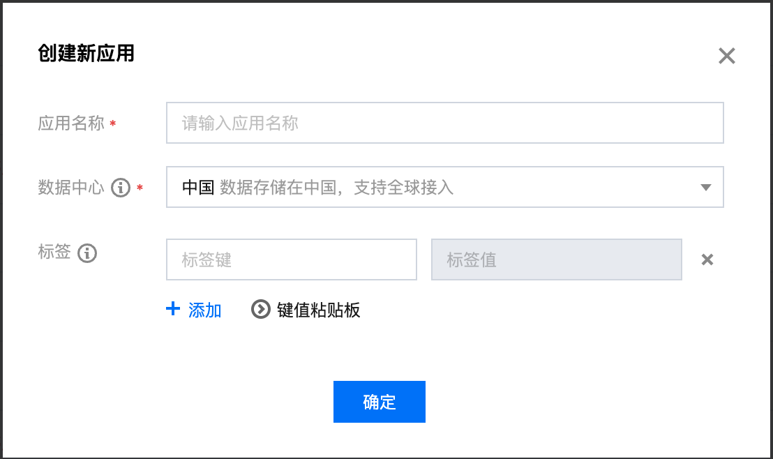 3. 输入应用名称、选择合适的数据中心,单击确定即可完成应用的创建。