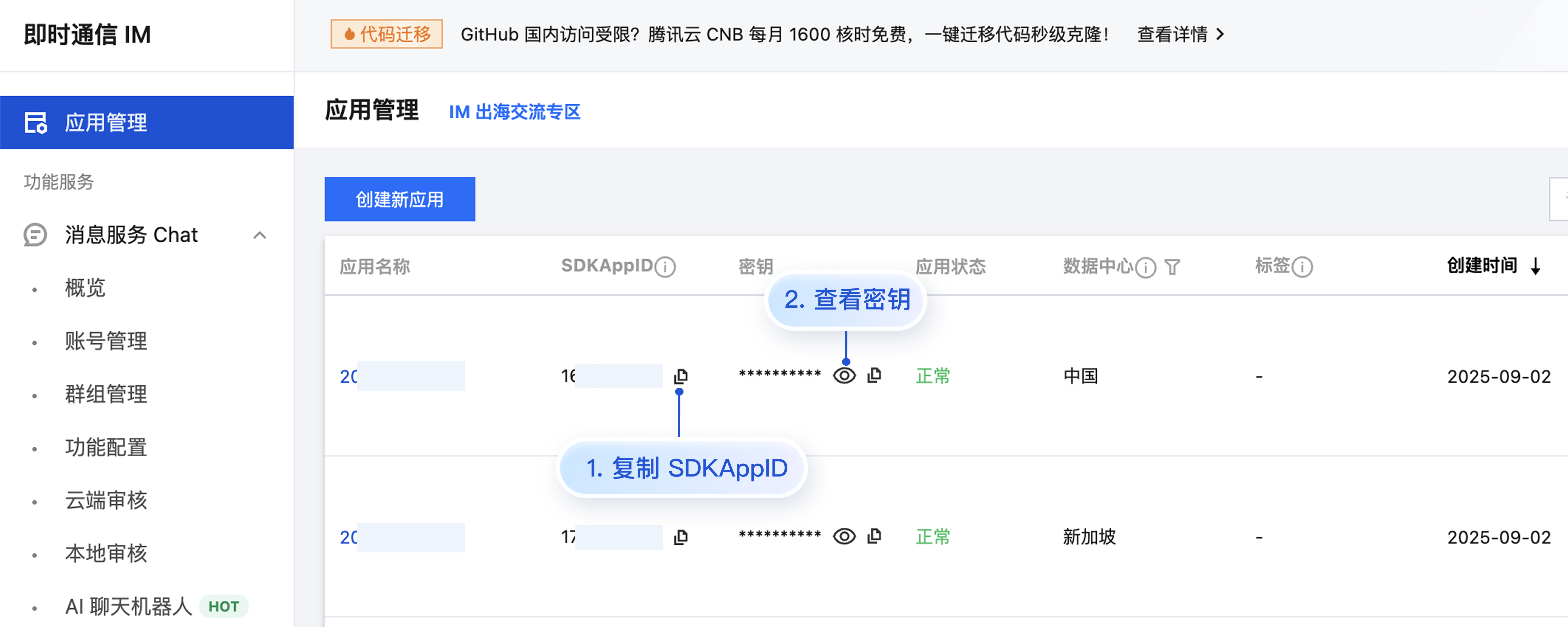 4. 在应用管理页面的 SDKAppID 列获取 SDKAppID 和密钥信息。