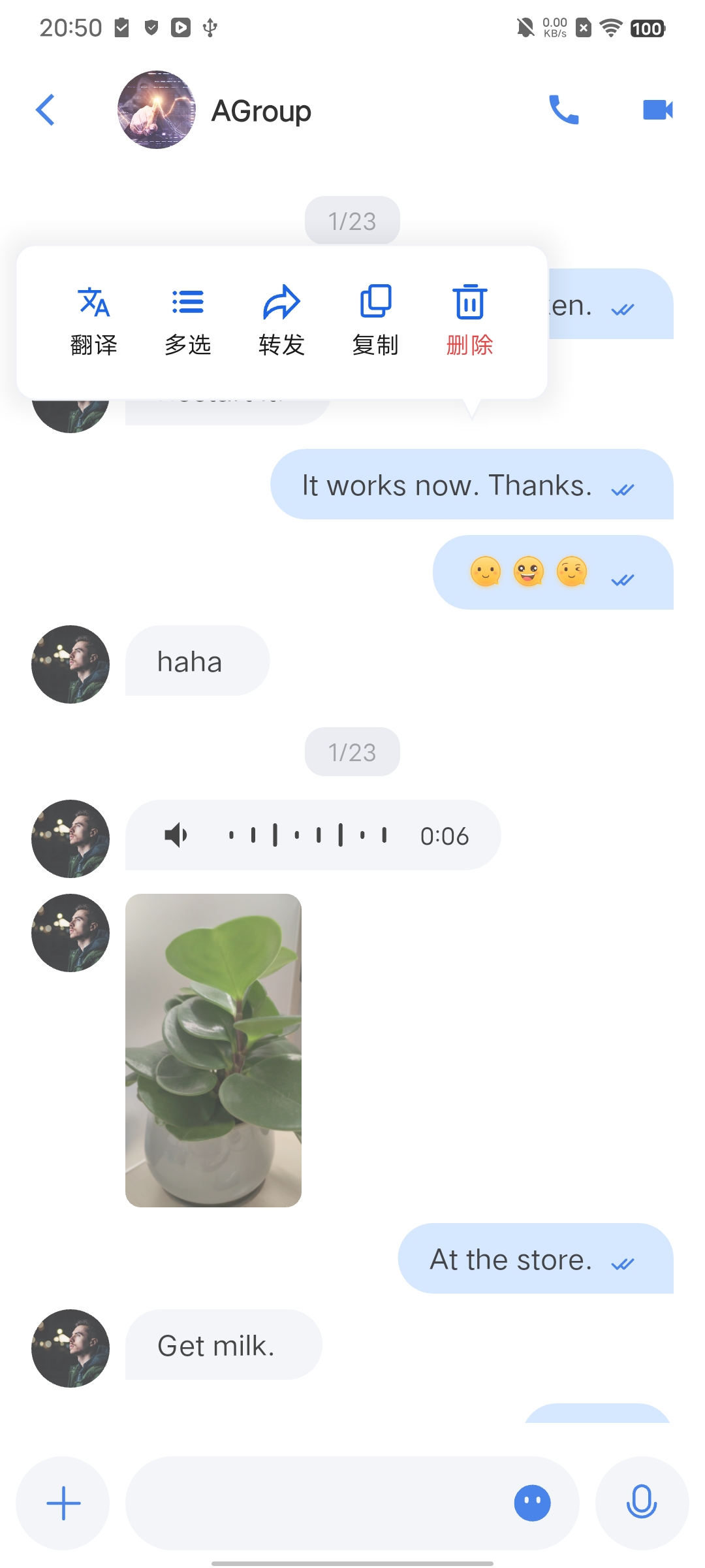 文本消息翻译功能:当您进入了聊天界面后,可以手动长按消息列表中的文本消息 item,在出现的菜单中,单击翻译按钮,翻译文本。