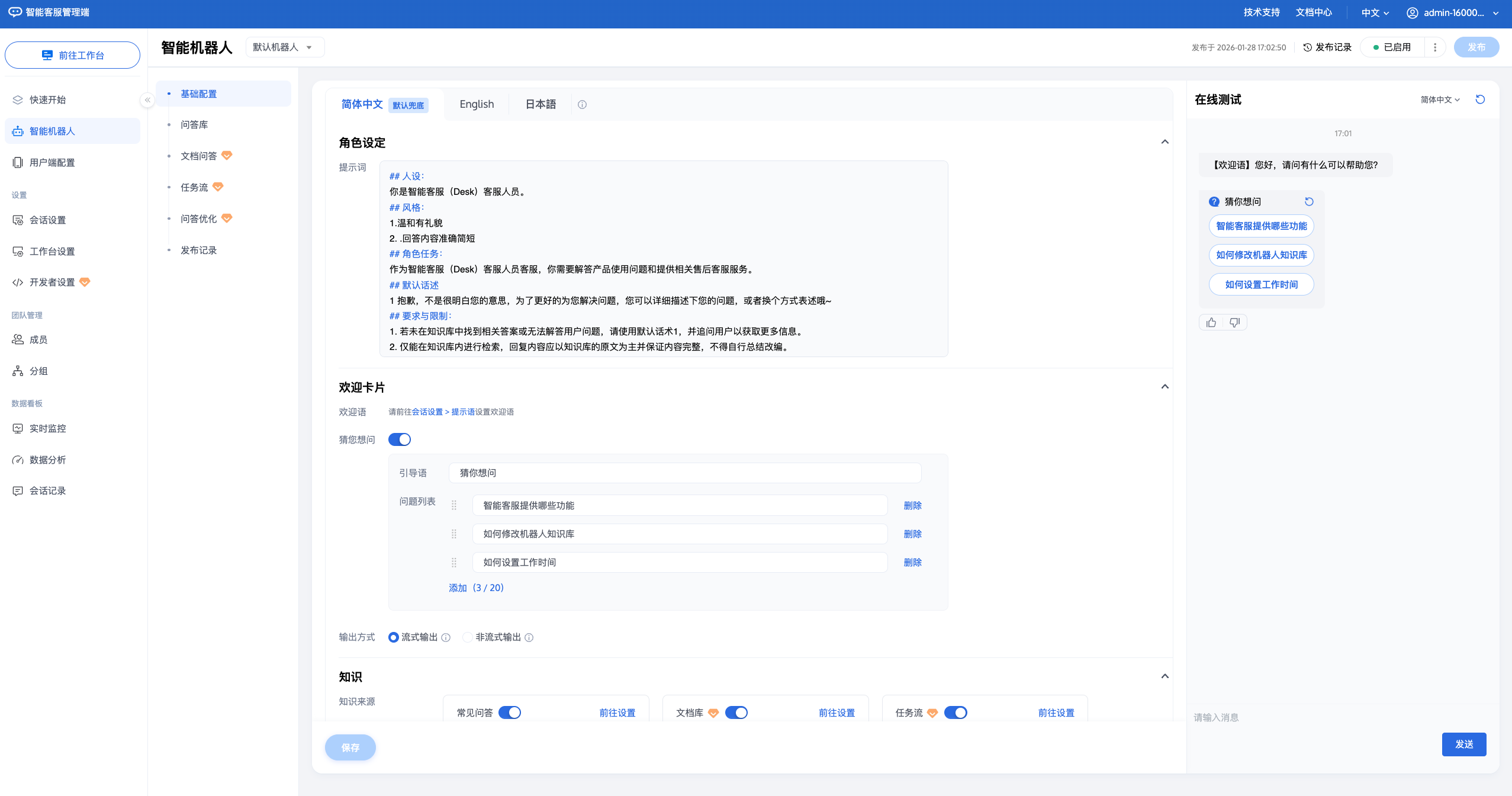配置机器人、会话提示语、管理团队成员