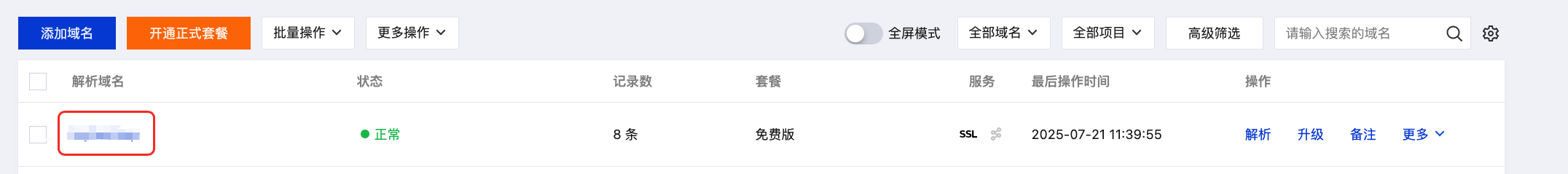 2. 在权威解析页面,单击目标域名名称,进入该域名的记录管理页面。如下图所示: